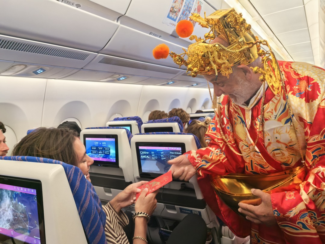 近日,由广州飞往荷兰阿姆斯特丹的中国南方航空CZ307航班上,一位外籍旅客身穿“财神爷”服装,手捧金元宝向每位旅客派发红包,大声说着“新年快乐、恭喜发财”,现场旅客纷纷伸手接礼物,客舱内充满了欢声笑语,在万米高空一同庆祝中国春节。