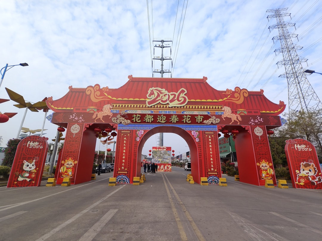 门楼主体采用中式传统建筑形制,飞檐翘角、斗拱彩画、雕花窗格一应俱全,对称造型稳重大气。设计团队在细节处融入岭南花市元素——廊柱挂上红灯笼,窗格间探出几枝三角梅,让原本庄重的牌楼多了几分花街的热闹鲜活。拱门式结构方便市民穿行,层叠檐顶则营造出空间纵深感,站在门下抬头看,年味扑面而来。