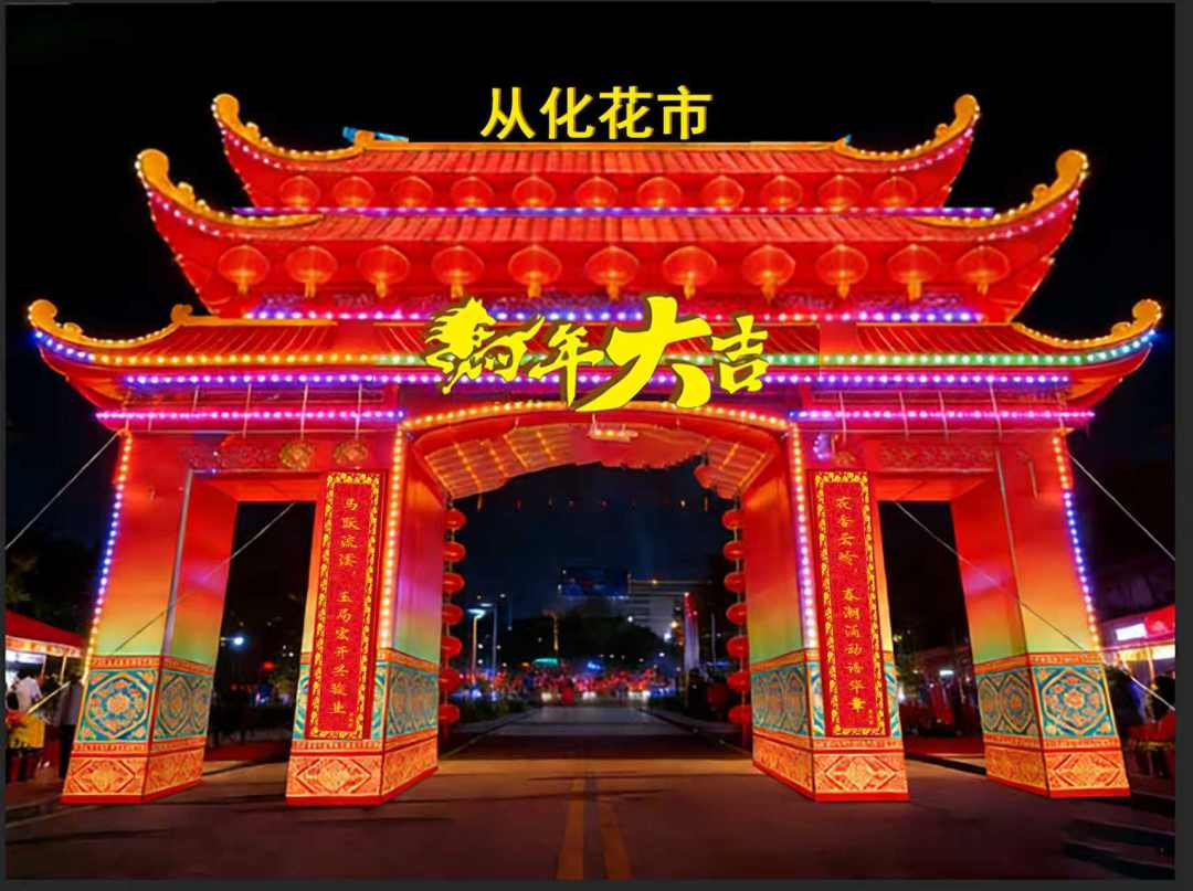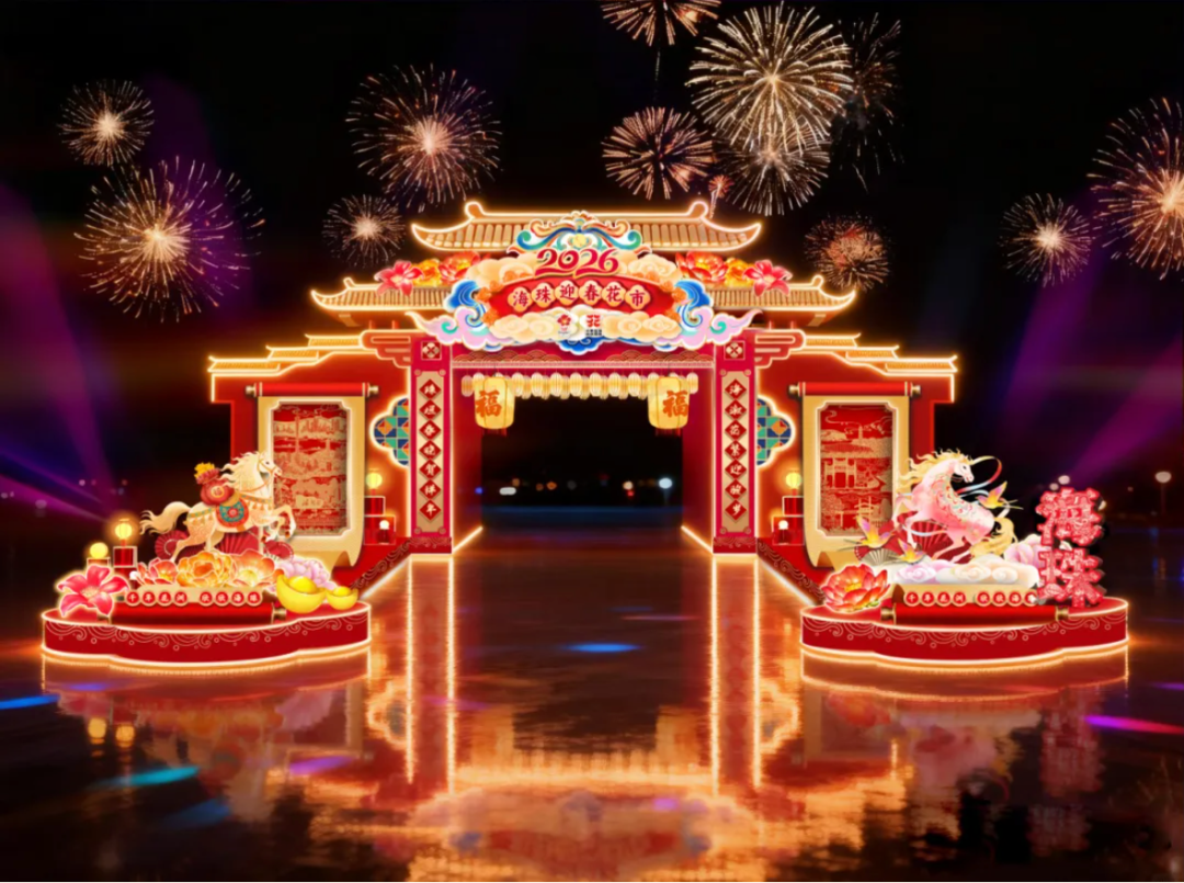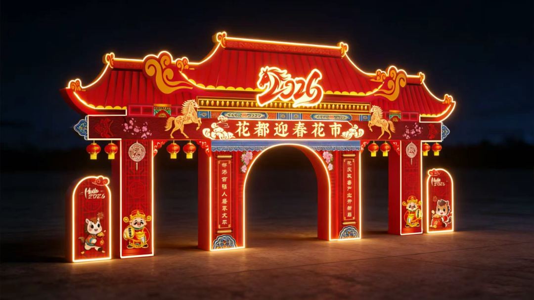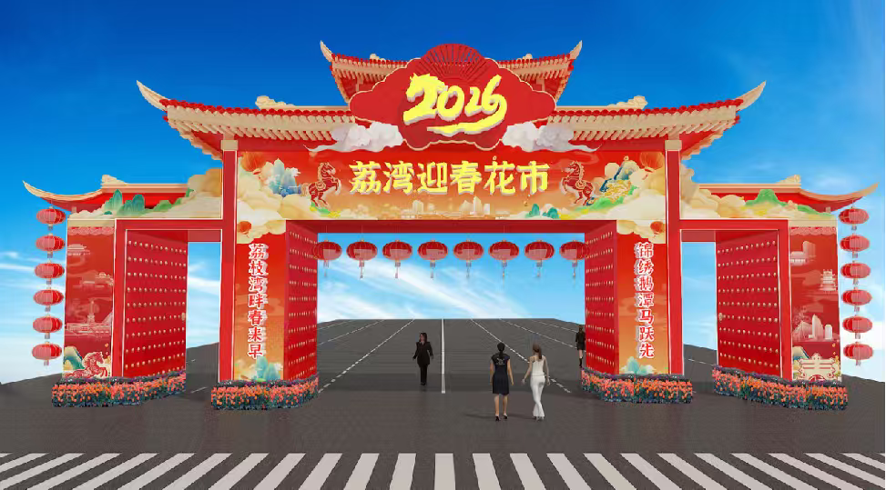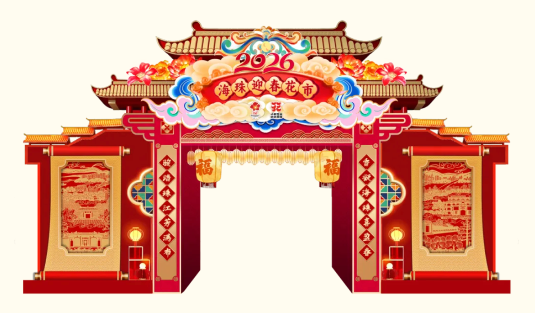 2026年荔湾区传统迎春花市牌楼以岭南经典牌坊为设计核心,融合春节喜庆氛围与马年主题。整体以新年红、鎏金色为主色调,庄重大气,吉祥喜庆。顶部设计借鉴陈家祠牌坊特色,传承创新;两侧采用岭南特色满洲窗样式,搭配吉祥对联与马年装饰,烘托浓厚新春氛围。
