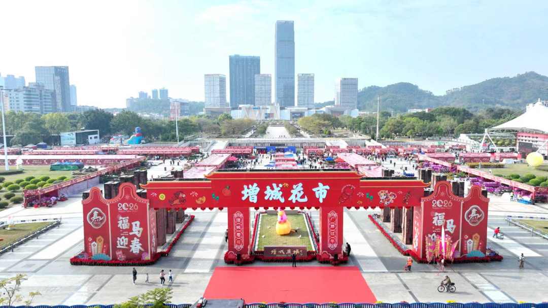 2月11日,2026年增城迎春花市在增城广场北广场拉开帷幕。增城迎春花市牌楼整体造型来源于岭南传统建筑镬耳屋,中间部分仿照传统瓦房屋顶,在主色调红色的基础上搭配金黄色的“砖瓦”。同时,牌楼两侧为经典的镬耳造型,尽显岭南传统风格。