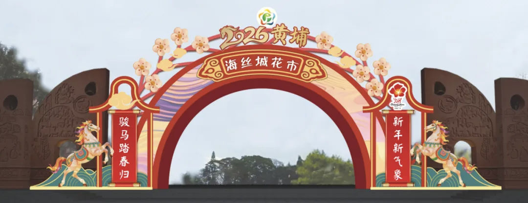 2026年黄埔迎春花市,以3+N的模式,继续在海丝城片区、科学城片区、知识城片区三地同时举办。黄埔公园(主会场)的牌楼拱门点缀香雪梅花,繁花朵朵盛开枝头,一片春意盎然,彰显黄埔的年轻活力与开拓创新,在新的一年里奋力向上、蓬勃发展。“骏马踏春归,新年新气象”,奔腾的骏马寓意奋进和成功,在春天中前行,为广大市民送上新年祝福,致敬广州开发区、黄埔区作为改革前沿区域在新时代中勇于开拓的发展精神。
