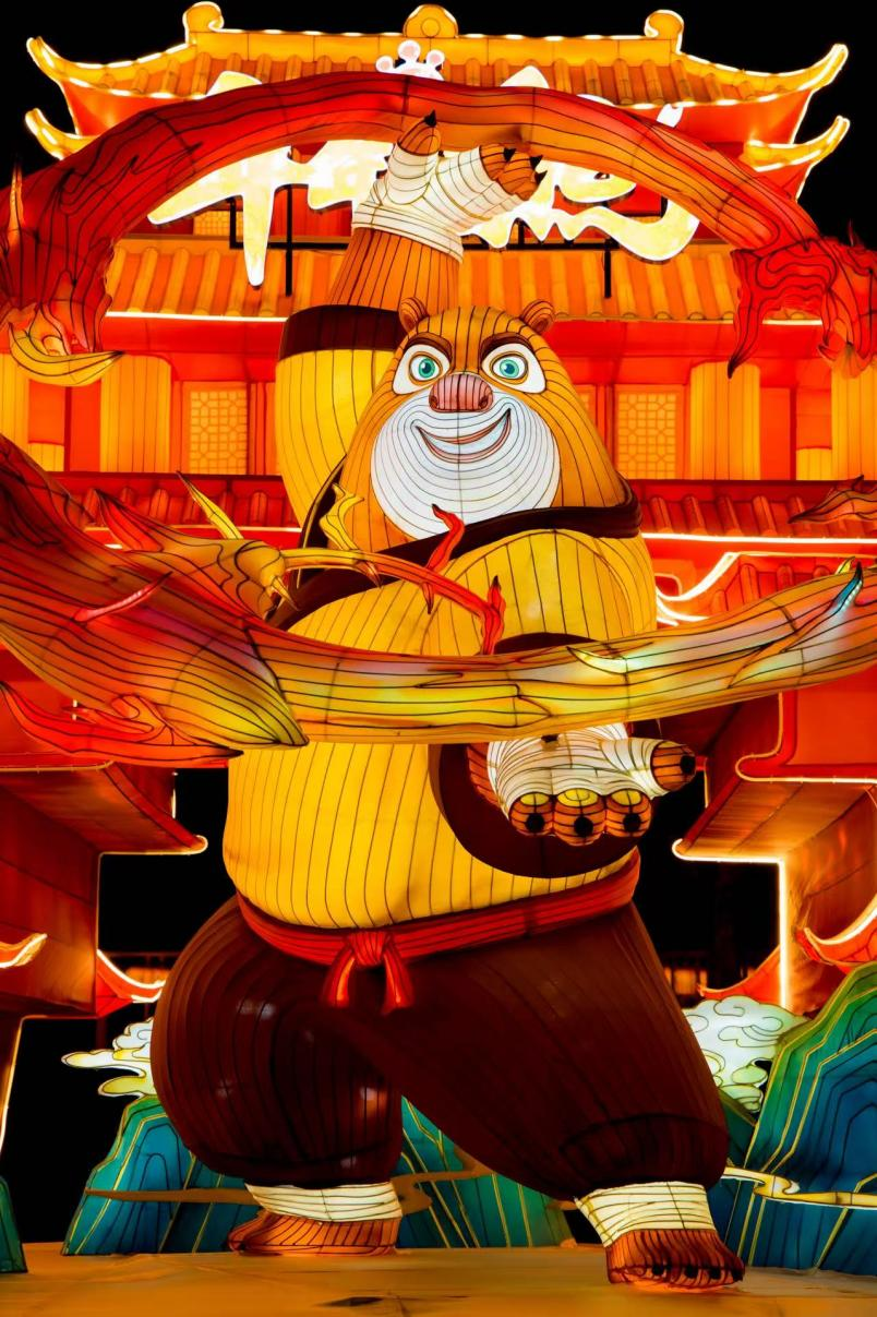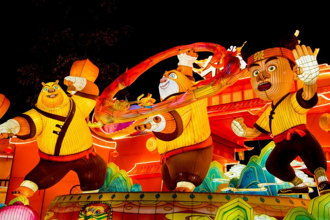 灯组以春节档电影《熊出没·年年有熊》为主题,身穿练功服的熊大、熊二与光头强共同守护“年关城”,呈现出欢乐喜庆又充满活力的新春氛围。