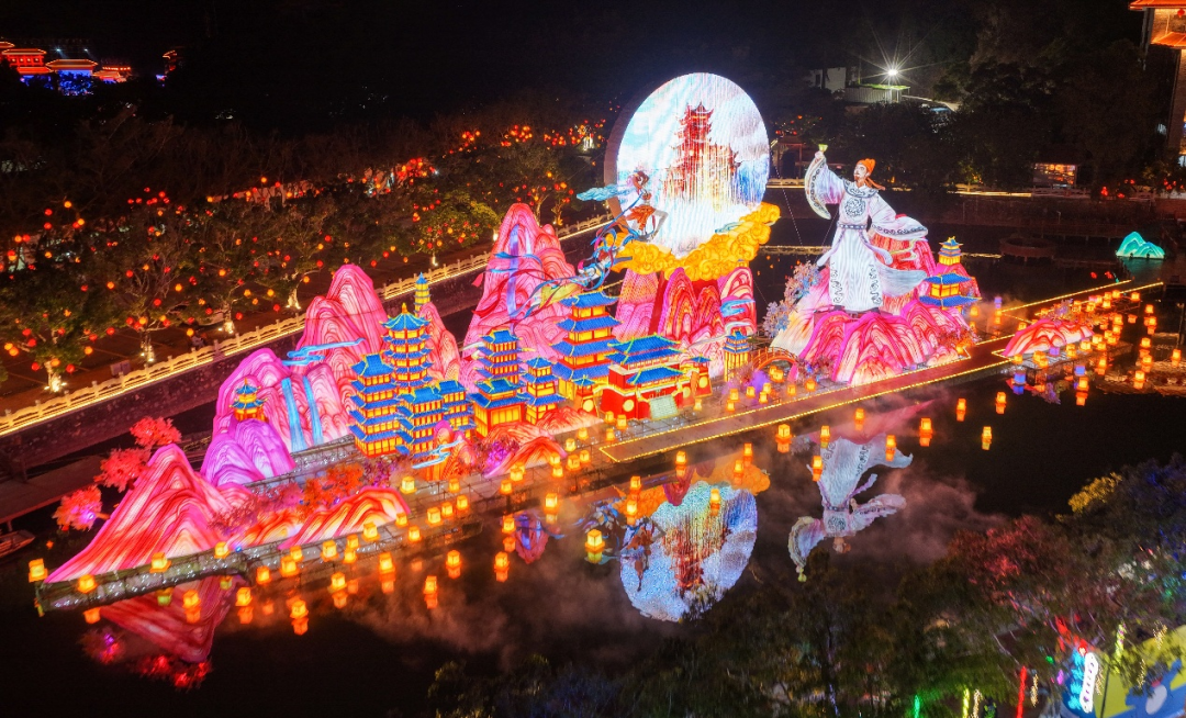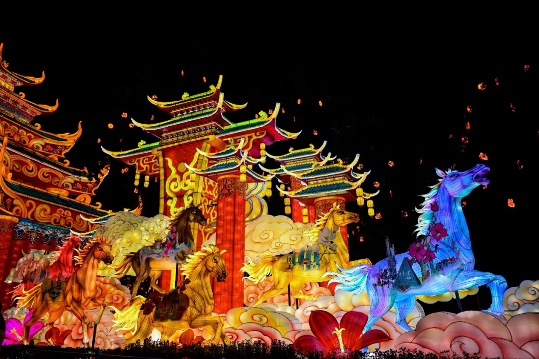 本届灯会以南沙天后宫景区、滨海公园为基础,“星河驰骋·骏马腾云”“绿野仙踪·生态和鸣”“逍遥天地·数智未来”“千年一梦·烟火人间”“同根同源·湾区和韵”等五大展区将整个园区构建为一个完整的“梦幻奇境”。