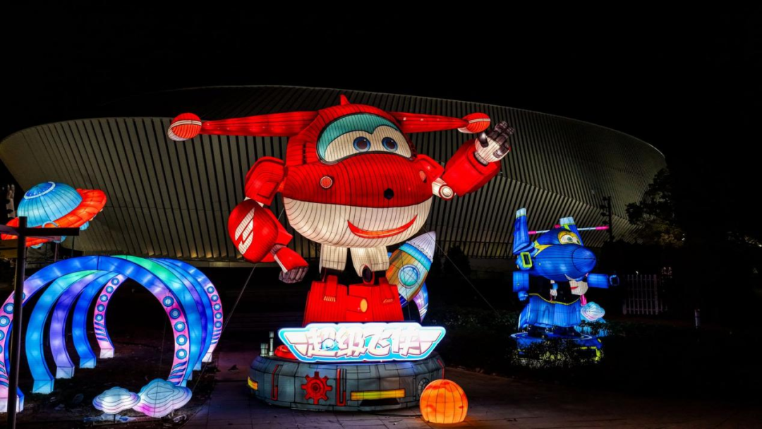 灯组以《超级飞侠》中深受喜爱的卡通形象为主体,通过立体造型与动态灯光效果,再现乐迪、小爱等主角的勇敢身姿。