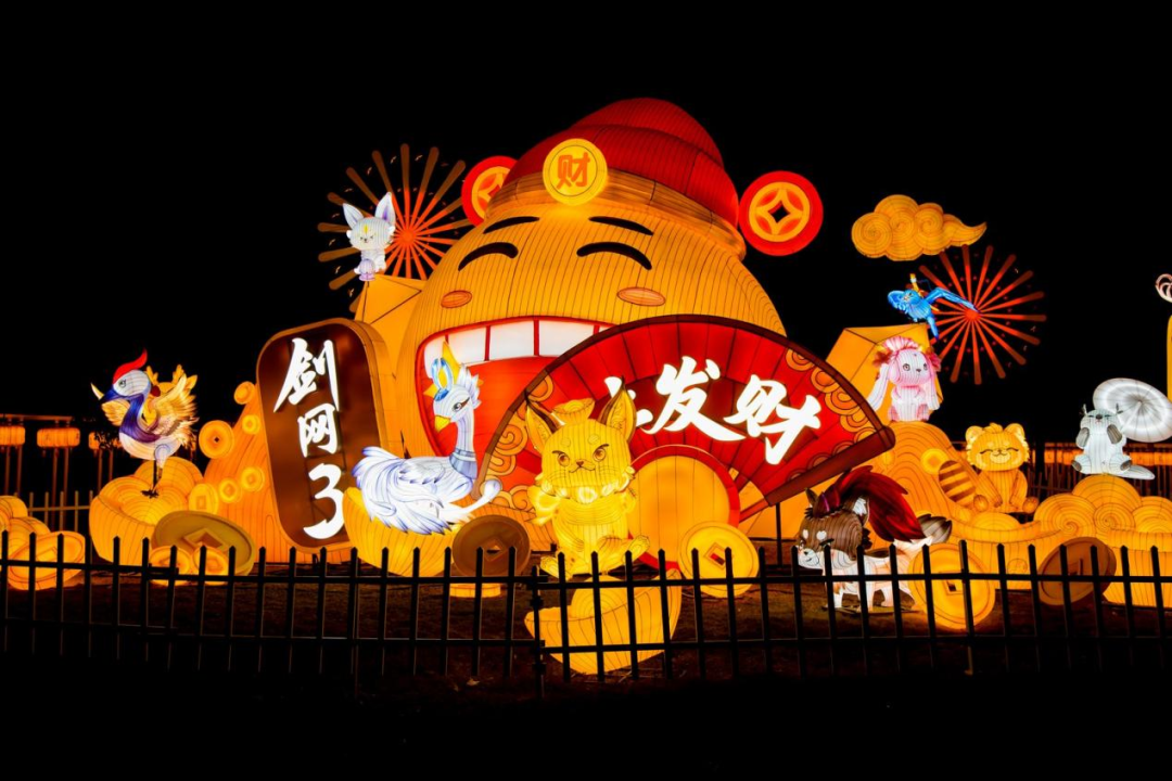 以《剑网3》游戏内容为背景,深度融入传统年俗,灯组中央,《剑网3》黄鸡大笑手拿“马上发财”折扇,周身环绕金色元宝与祥云。