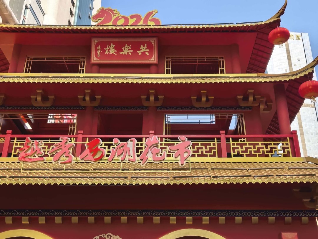 2月11日下午,2026年广州越秀西湖花市主牌楼“共乐楼”挂上了由著名书法家连登题写的牌匾,标志着主牌楼正式完工。11日晚上,主牌楼首次亮灯,很多市民游客先睹为快并拍照留念。
