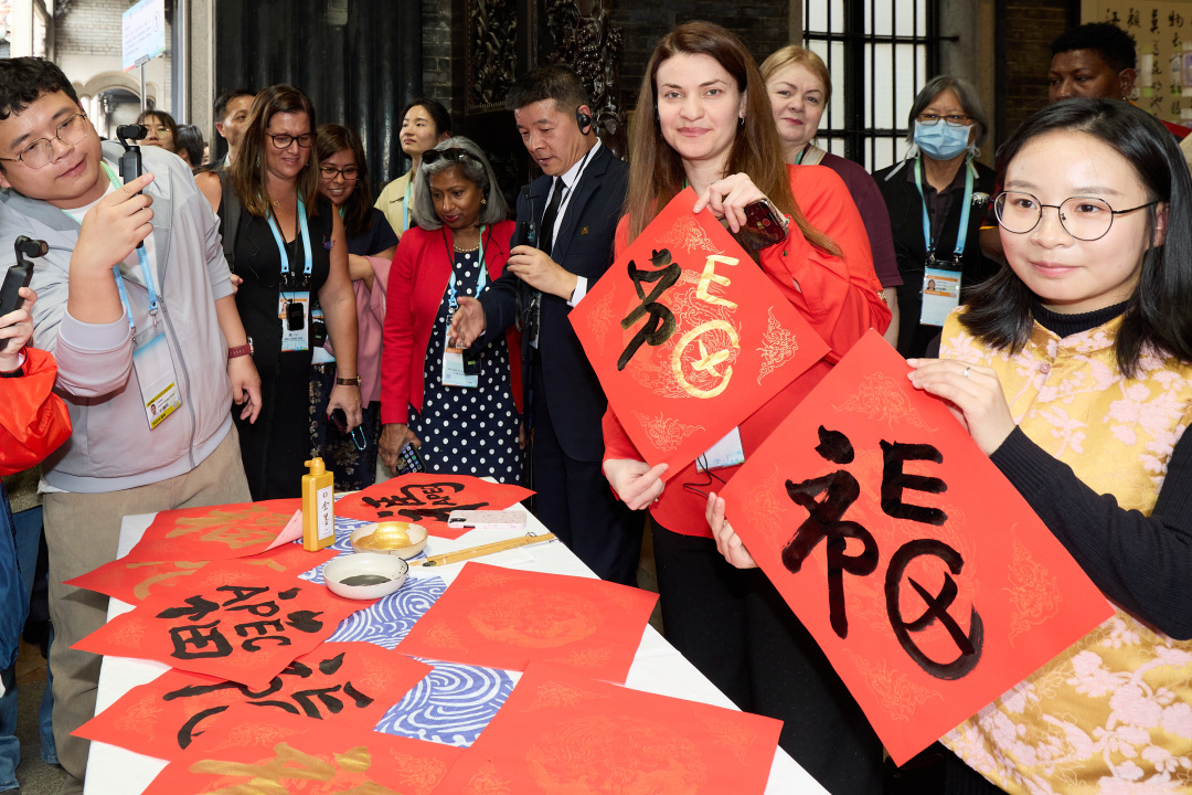 和广州城市大街小巷一样,白云国际会议中心周边的红色灯笼在灿烂阳光中展示着新年的喜庆。中国的传统佳节引发了嘉宾们的好奇、喜爱和沉浸式参与。来自美国的嘉宾Adrienne听说这是迎接即将到来的中国春节,笑着表示热烈祝福。在游览西关时,浓郁的春节气氛感染着每一位来宾。在陈家祠,大家提笔写“福”,踊跃学习用粤语说出“新年快乐”“恭喜发财”“身体健康”等吉祥话语。来自巴布亚新几内亚的NancyRedmondIrwin亲手书写了“福”字,带回家赠予女儿。