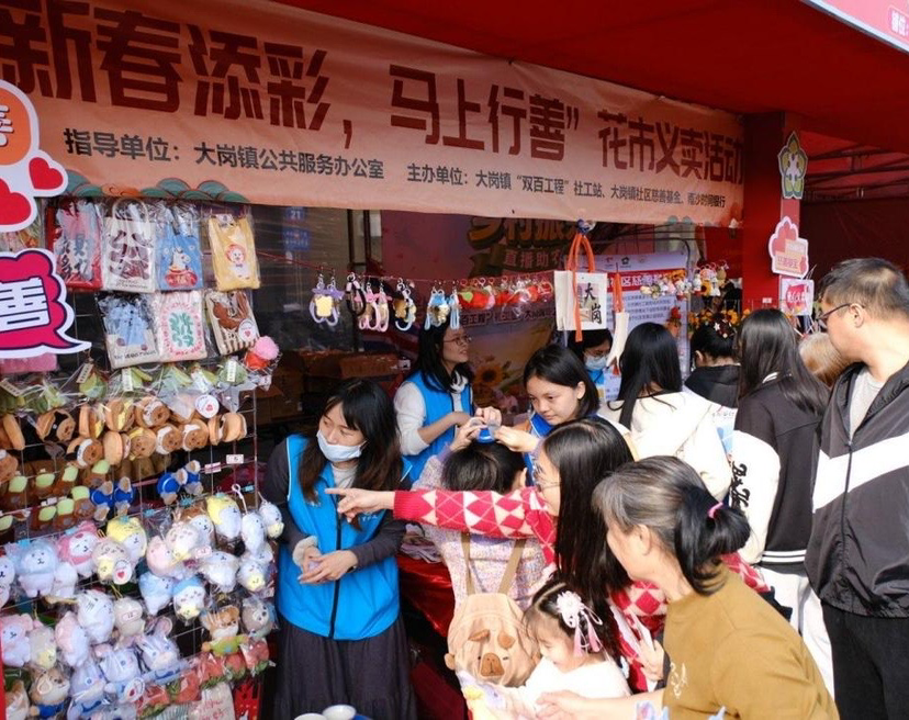 新春将至,年味渐浓,广州市南沙区大岗镇花街迎来了别样的温暖色彩。自2月7日起,由大岗镇公共服务办公室指导,镇“双百工程”社工站主办、南沙时间银行协办的“新春添彩,马上行善”社区慈善基金宣传暨花市义卖活动温情开幕,活动持续至2月15日,每日9:00—21:30在大岗镇花街指挥部公益宣传区开展,让慈善暖意融入新春市集。
