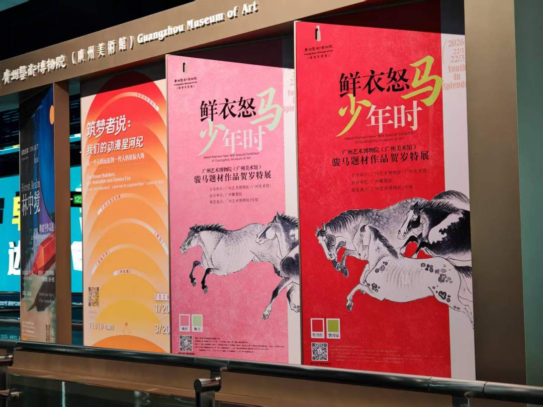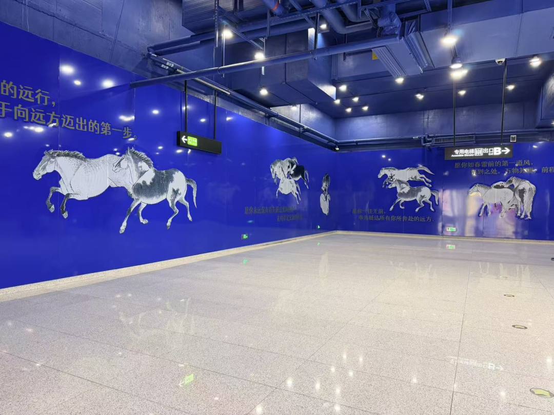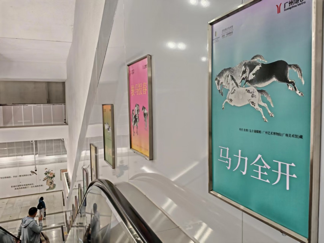 恰逢马年新春,艺栈更深度联动广州艺术博物院正在展出的“鲜衣怒马少年时——骏马题材作品贺岁特展”,将《七十龙媒图》中的骏马元素进一步延伸,装点站厅空间。“愿你如原野清风,一往无前,率先抵达所有你所奔赴的远方”等暖心贺岁文案,与骏马意象交相辉映,既传递着新春的美好期许,也彰显着“少年意气、奋勇争先”的时代精神,营造出浓浓的马年贺岁氛围,诚邀市民游客乘地铁、赏名画、迎新春,赴艺博院过大年。赤岗塔地铁艺栈,立足在地文化,融合文博资源,使地铁站成为集宣传、展示、美育于一体的温暖“城市客厅”,让正能量在市民游客行走中悄然浸润、触手可及。
