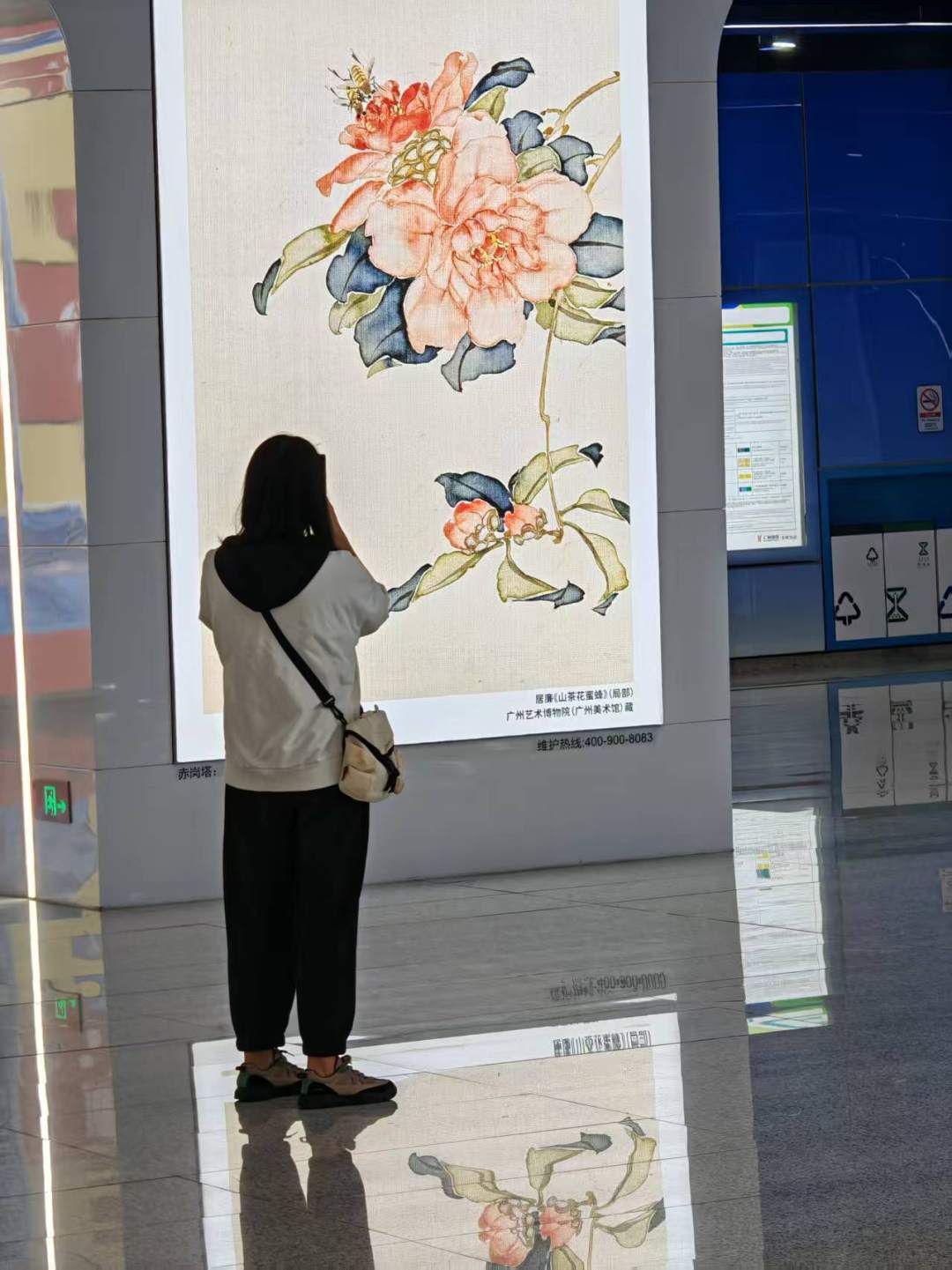 “风物花城”板块则聚焦岭南本土风情,居廉《荔枝蝉鸣》中晶莹的果实、灵动的秋蝉,尽显南国物产的鲜活灵动;张穆《七十龙媒图》里姿态各异的骏马,勾勒出岭南名家的笔墨神韵。更令人心动的是,廊道墙壁上萃取明四家沈周《湖山佳胜图卷》中的湖山、小舟等核心意象,搭配“小舟从此逝,江海寄余生——而你的‘江海’,或许就在下班后的落日里”等走心文案,让奔波的通勤时光多了一份诗意与治愈,让艺术与市民游客不期而遇、温暖相拥。