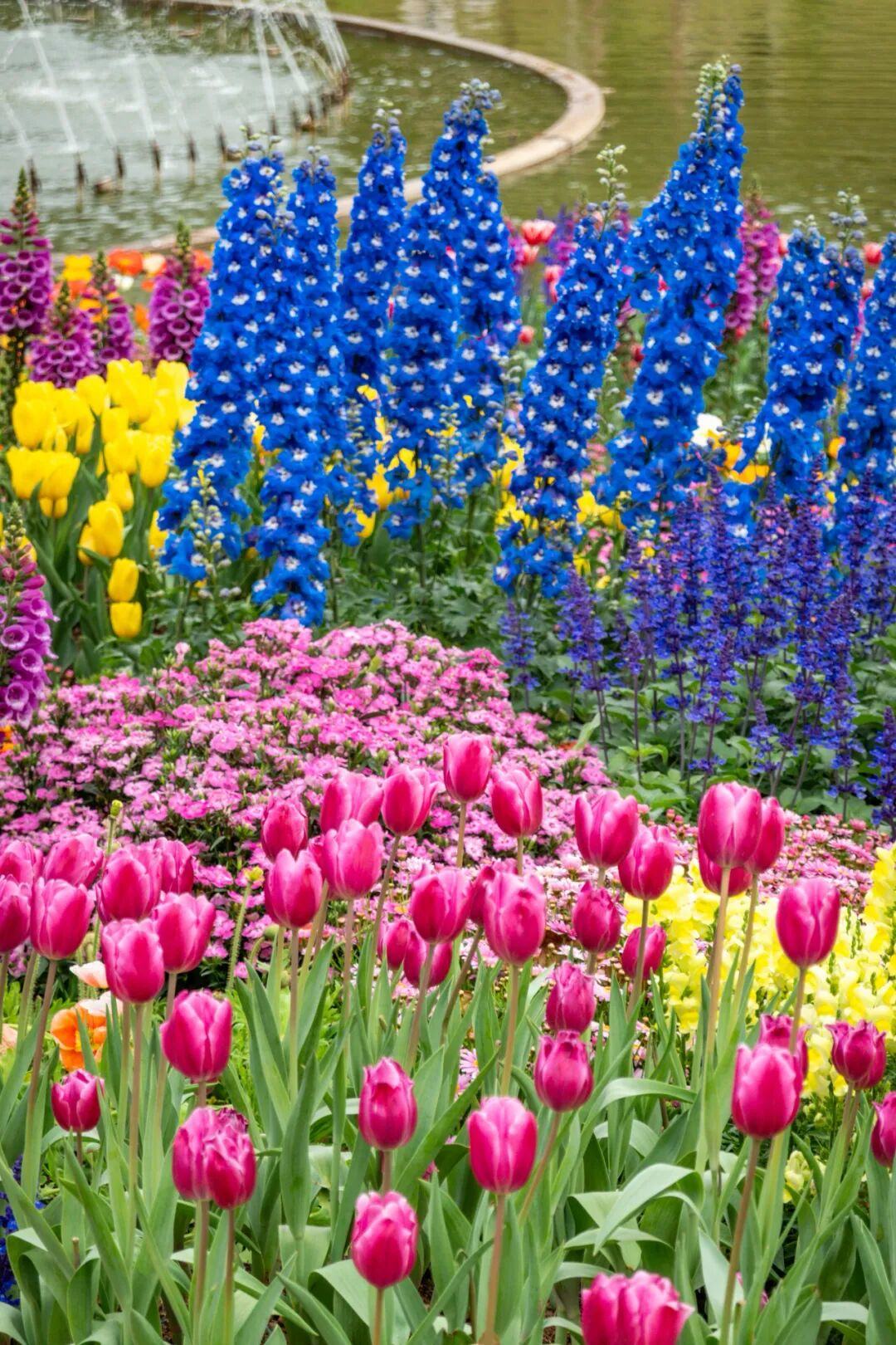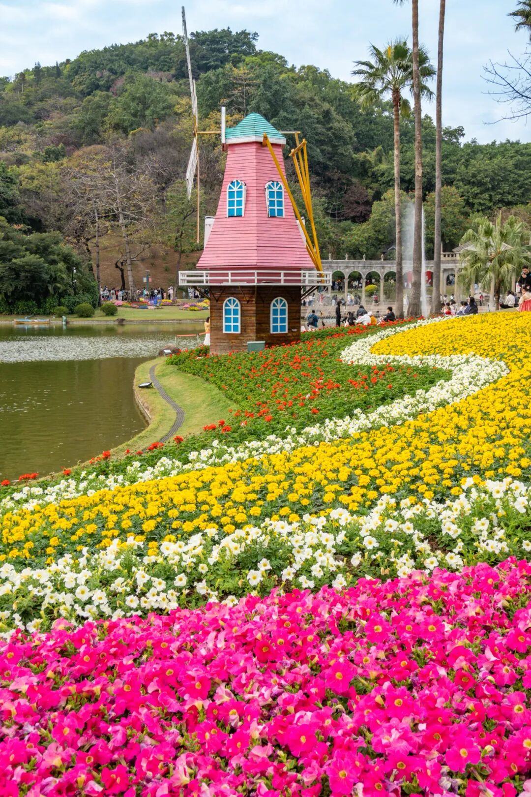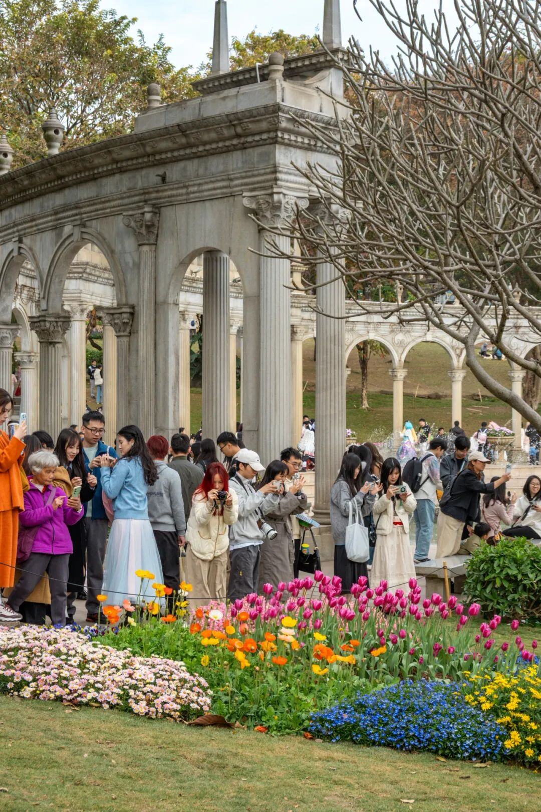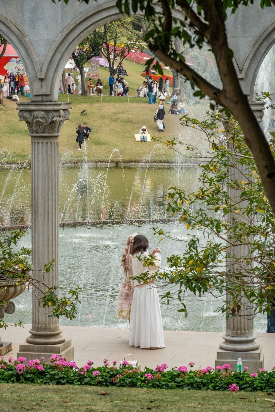 郁金香与罗马柱廊、滟湖喷泉、童话风车相映成趣,恍惚间如漫步于春天的欧式庄园。