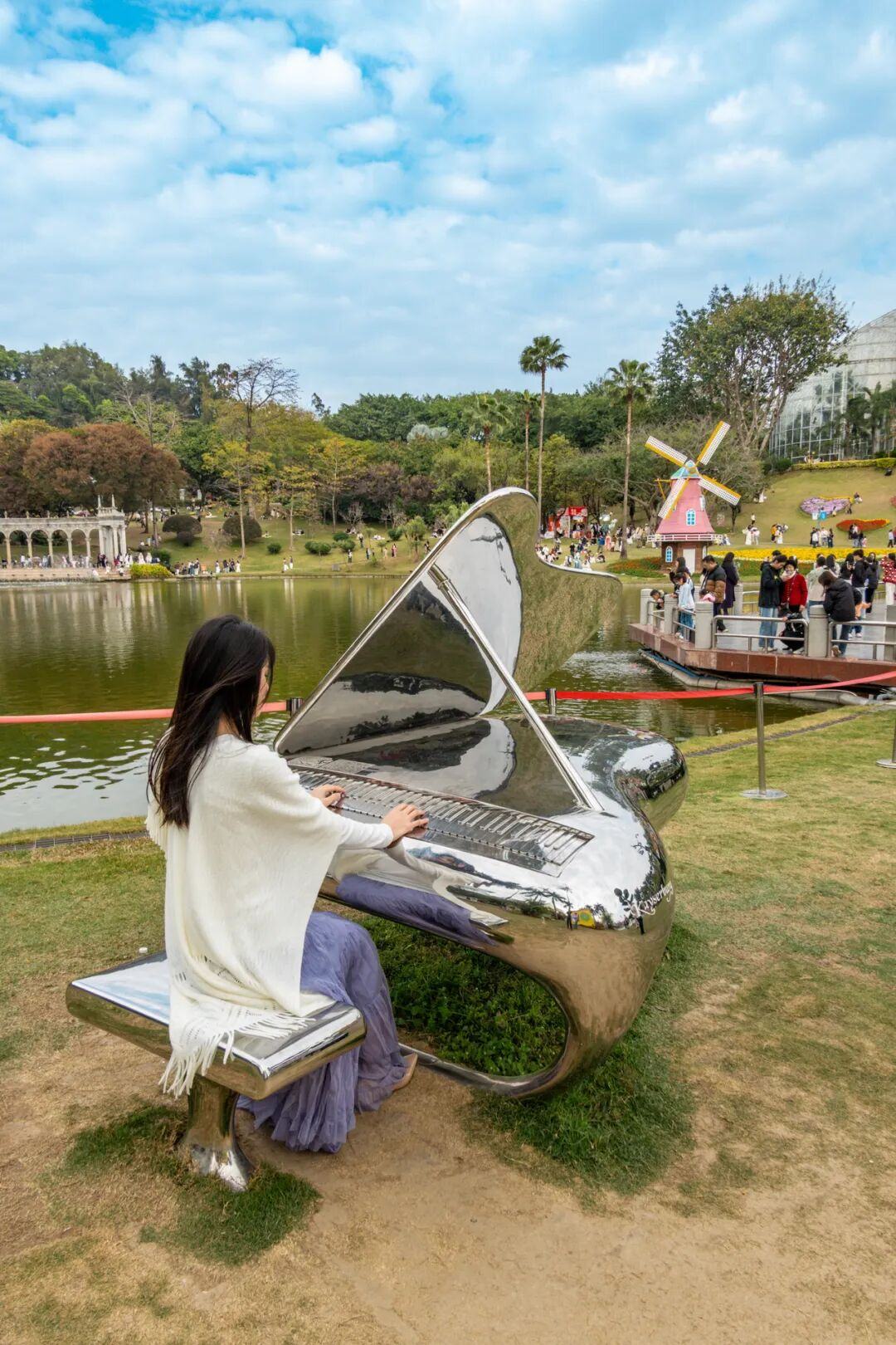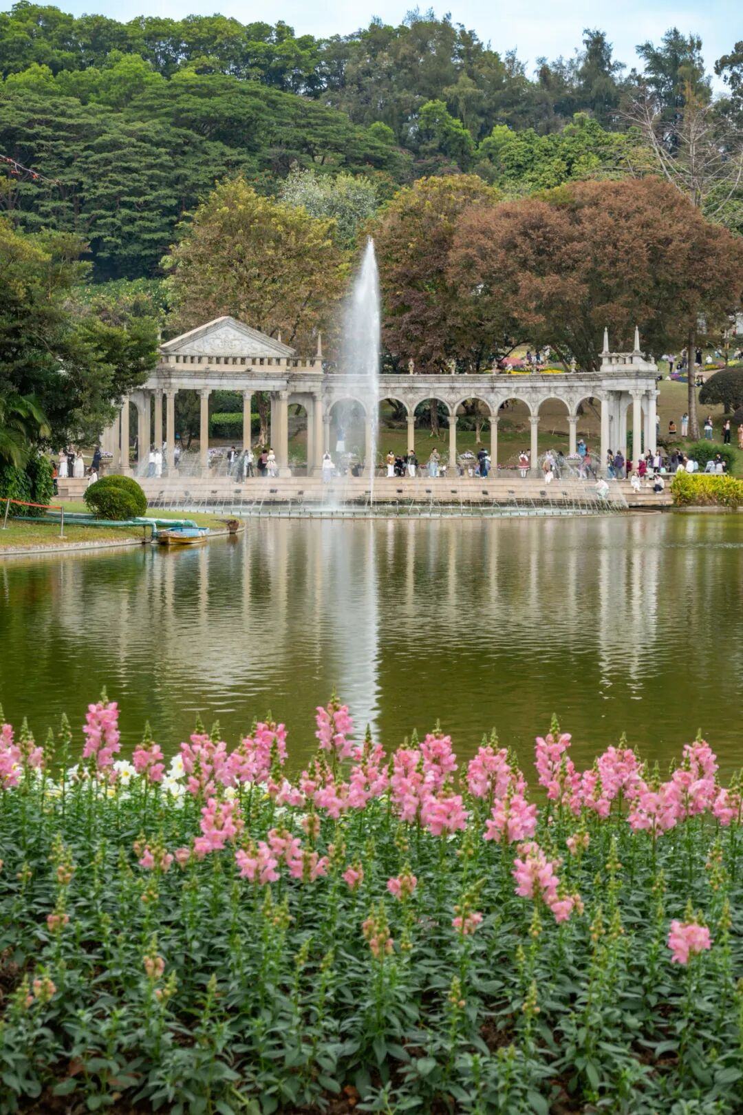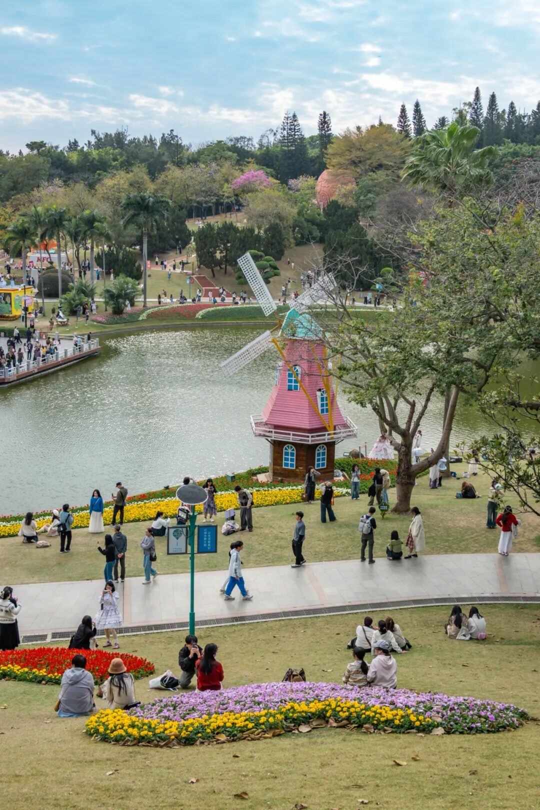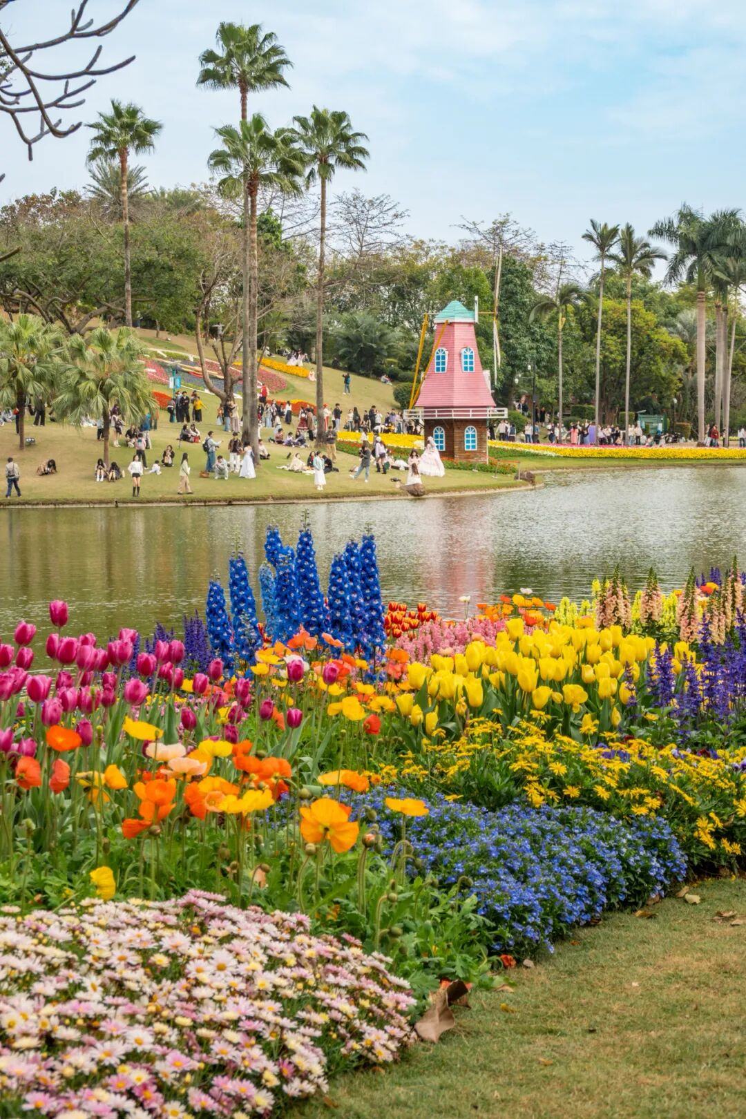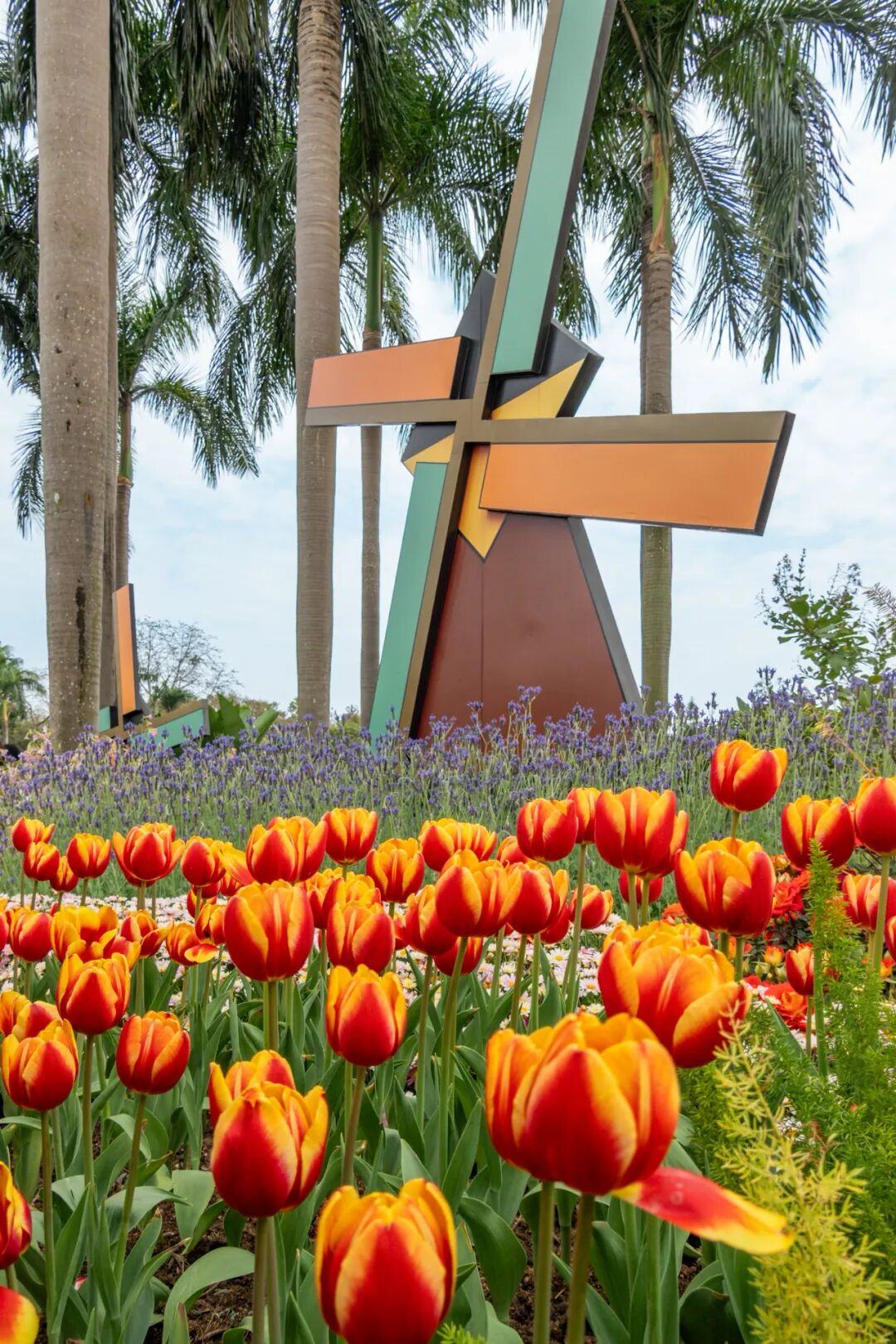 郁金香与罗马柱廊、滟湖喷泉、童话风车相映成趣,恍惚间如漫步于春天的欧式庄园。