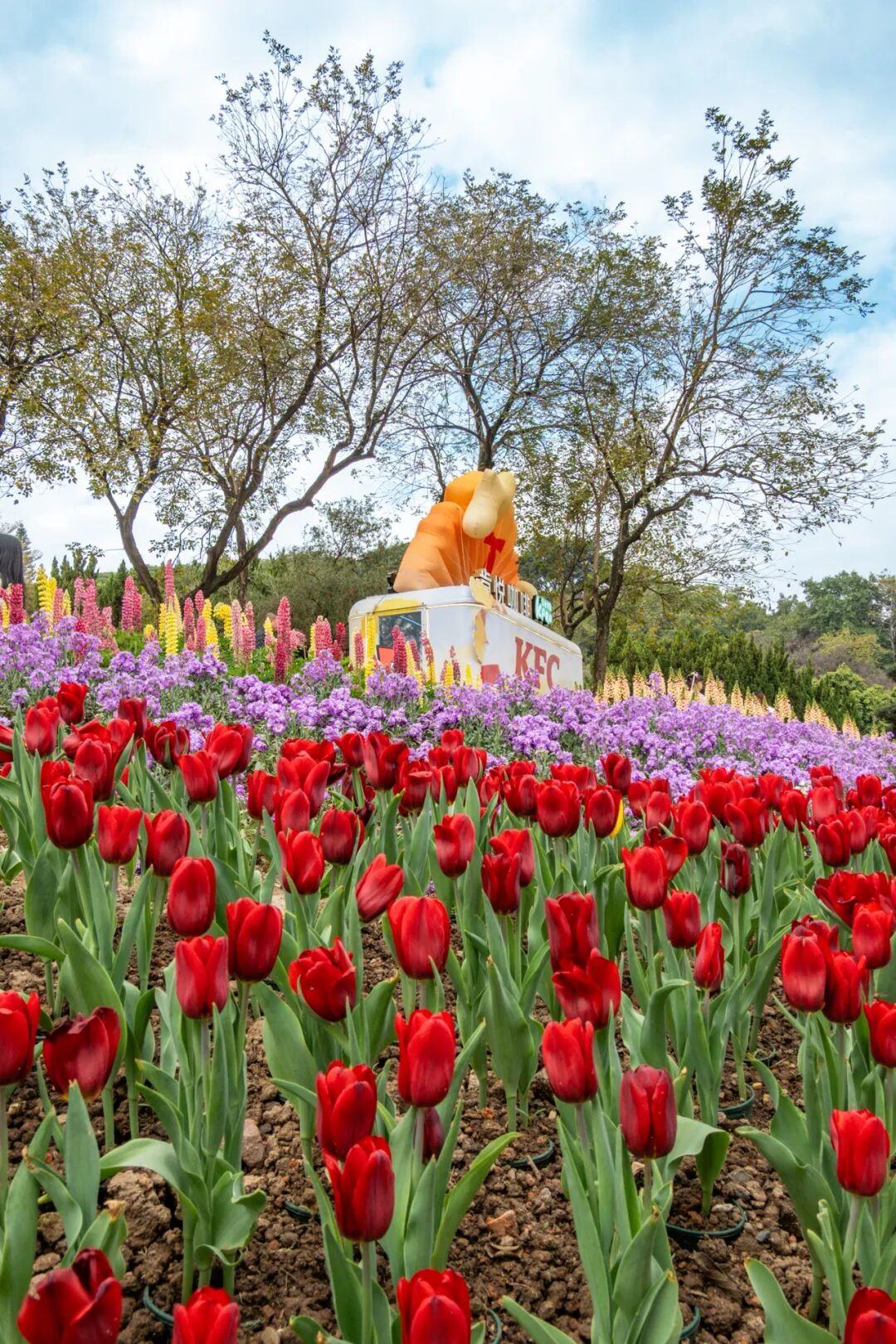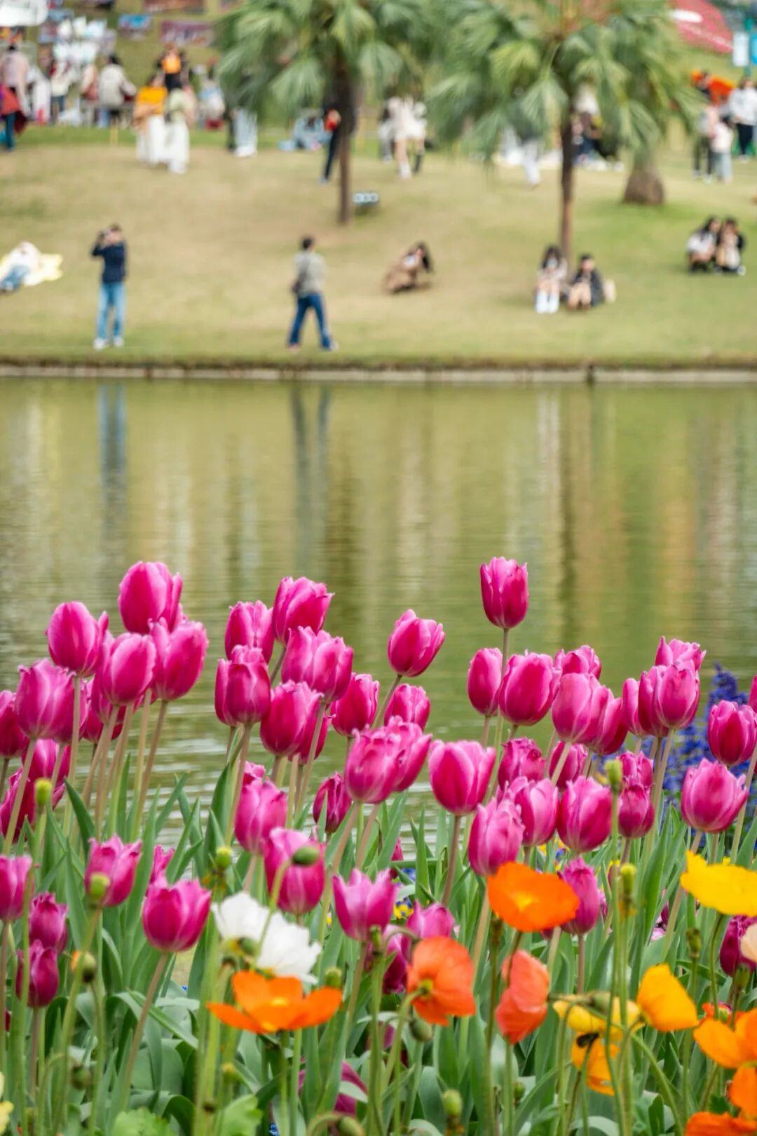 只见山坡上的草地里以及湖边种植了各种色彩的郁金香,有深浅不一的红、娇艳明快的黄、浪漫温柔的粉,还有稀有品种“夜皇后”,在阳光下层层铺展,汇聚成一片延绵起伏的花海,仿佛一幅流动的油画。