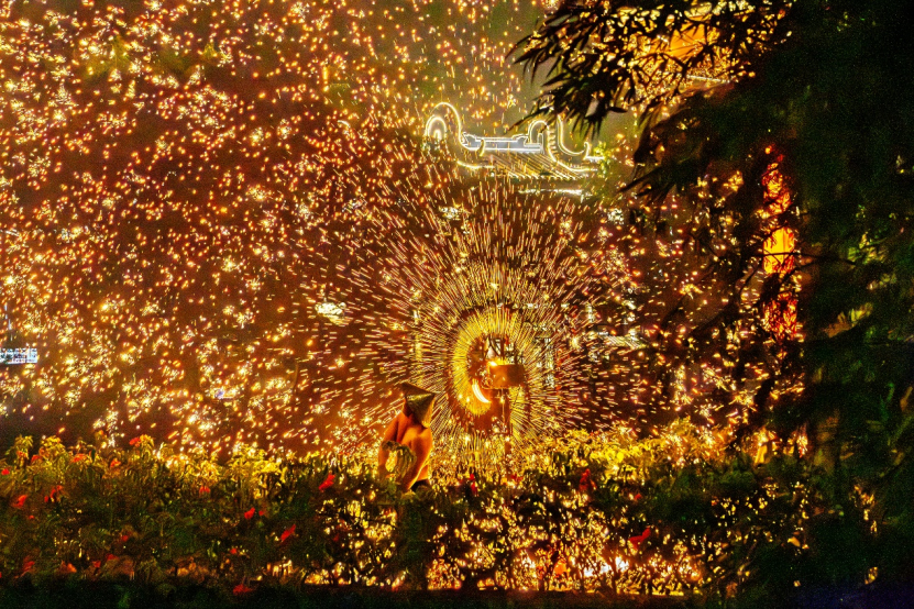 客家鱼灯与游龙穿梭巷弄巡游,营造出最具年味的流动夜景;非遗“打铁花”震撼上演,1600℃铁水化作漫天金雨,交织出一幅“火树银花”的灿烂画卷。