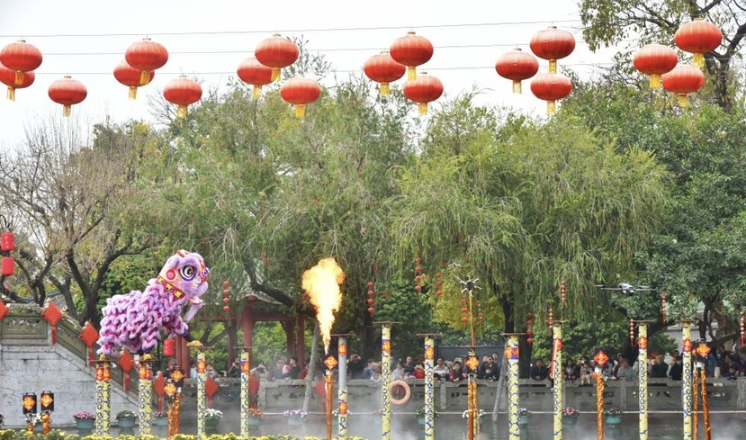 山水实景醒狮特技展演以宝墨园古建、流水、石桥为天然背景,上演多场高难度好戏。《幻彩群狮闹新春》以10头彩狮搭配大头佛、财神登场,欢快鼓点点燃现场热情;《龙腾马跃庆丰年》创新融合舞龙与非遗布马舞,龙狮共舞、骏马奔腾,演绎“龙马精神”的时代风采;《水上扁带狮踏浪》邀请全国扁带冠军演绎,雄狮踏扁带凌波而行,实现传统技艺与现代特技的惊艳碰撞。最为吸睛的要数压轴节目《雄狮高桩闯烈焰》。一头紫色雄狮纵身跃上距湖面3米多的水上高桩,伴着铿锵鼓点闪扑回旋、穿越火焰桩阵,惊险动作扣人心弦,既彰显醒狮技艺的精湛,更寓意岭南儿女敢闯敢拼的精神,传递马年“紫气东来、大红大紫”的祈愿。详细请点击下图↓↓↓