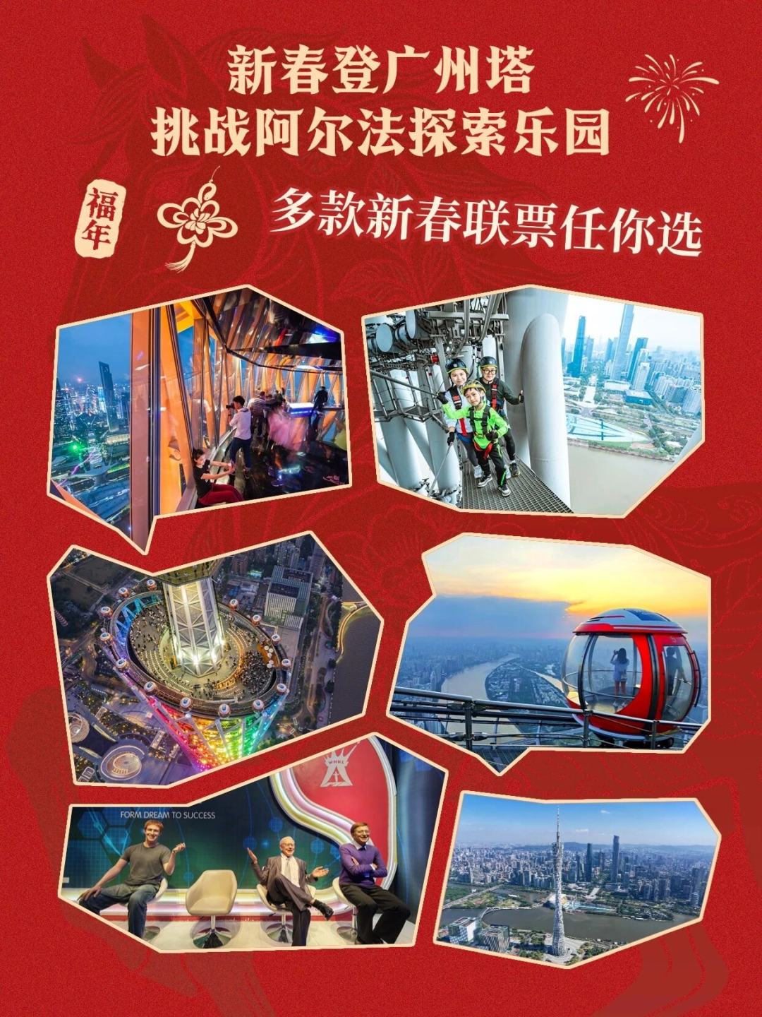新春临近,广州塔与阿尔法探索乐园携手推出四款特色高空联票,融合观光、体验与挑战,为市民游客提供“一站式”云端迎新选择。从433米白云星空观光厅静览城景,到460米摩天轮俯瞰全城温柔环抱;从450米户外平台踏足“云端漫步”,再到480米极限项目“极速云霄”挑战勇气——系列联票将登高望远、高空游乐与蜡像馆探访结合,寓意“新年登高步步升”。即日起购票可享早鸟优惠,同步限量发放广州塔定制好运红包封面,邀游客在花城之巅开启鸿运之年。
