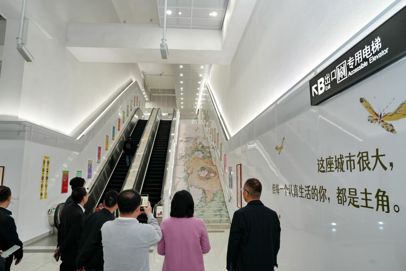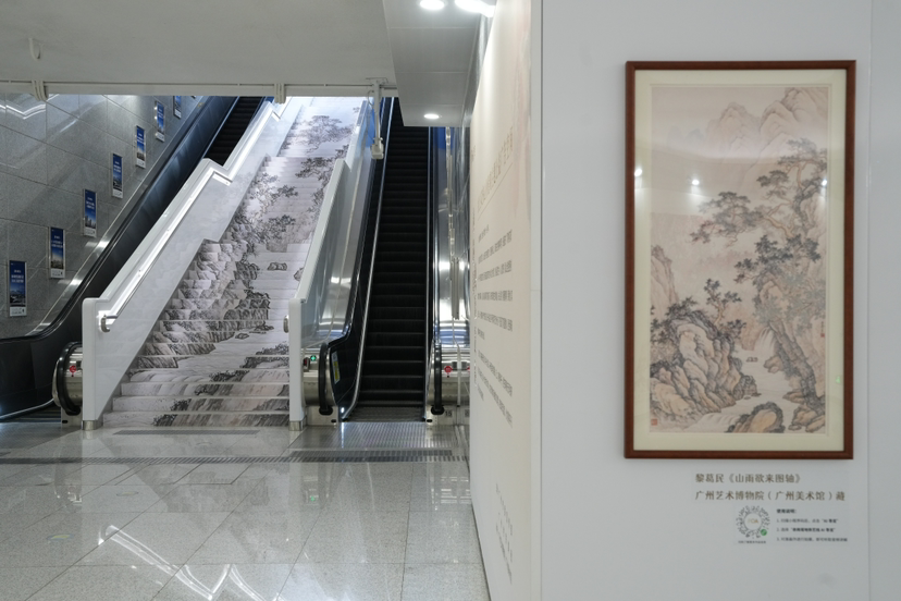 站内设置的多处“趣味打卡点”,巧妙地将馆藏画作与当代人的情感共鸣相融合,吸引了不少乘客驻足拍照。治愈系打卡点将沈周、朱耷等名家画作与“你的生活轨迹,不言不语,却已然成诗”等暖心文案结合;楼梯则化身为艺术步道,连绵铺展的步梯图案,仿佛行走漫步于弘仁、居巢的笔意之中;12块主题灯箱集中呈现居廉、关山月等大师等14件馆藏精品,营造出沉浸式的艺术氛围。