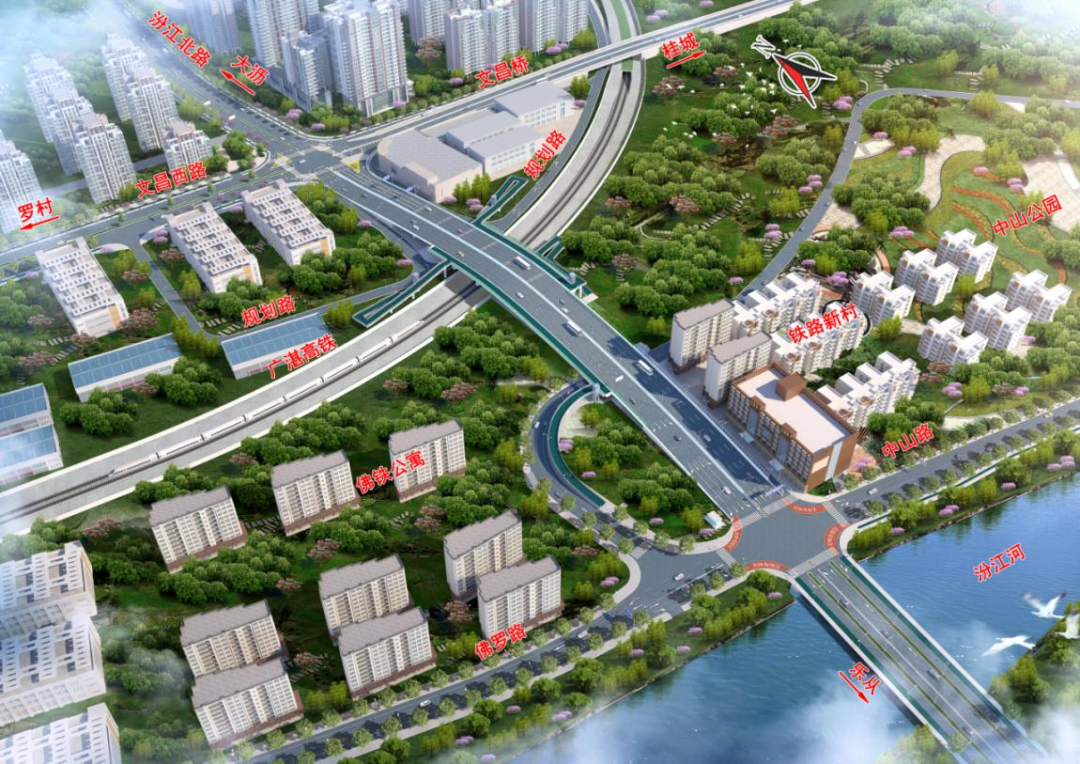 项目路线全长1.811公里,其中汾江路主线长582米,新建跨高铁大桥1座(全长289米,分左右幅上跨在建广湛高铁),同步建设慢行天桥4座,并对佛罗路、中山路、文昌路3处平面交叉口进行改造,主线采用一级公路标准兼顾城市道路功能,设计为双向八车道,设计时速60公里,显著提升区域机动车通行能力与慢行系统安全性。