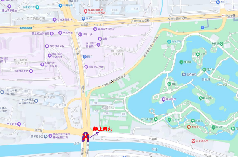 汾江桥往汽车站方向(南往南调头)车辆请按以下路线绕行:佛罗路→1号疏解便道→文昌东路→汾江路跨铁路桥。