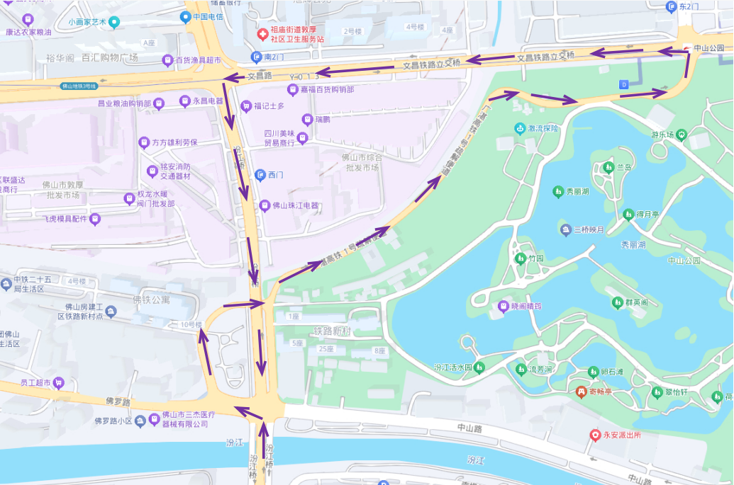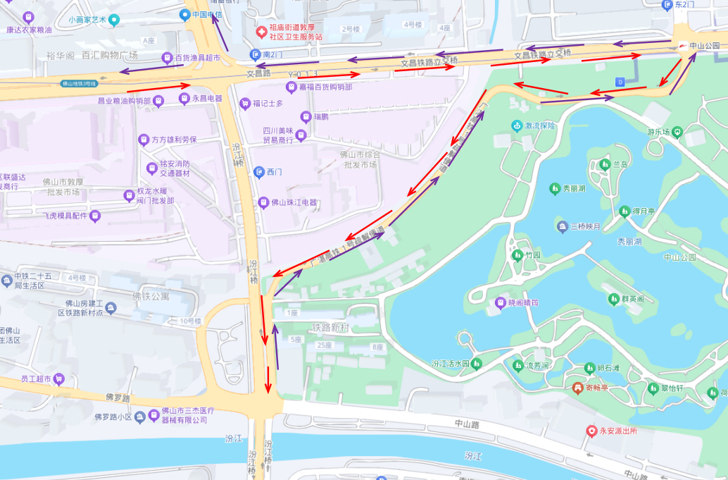 汾江北路或文昌西路→文昌东路→1号疏解便道→佛罗路、中山路或汾江桥。