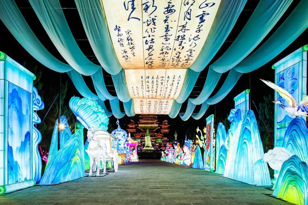 在“千年一梦·烟火人间”展区,秦汉长歌灯组还原了古丝绸之路的盛景,驼铃声声(通过定向音响模拟)与秦小篆、汉赋等文化符号相得益彰;唐宋风华灯组以苏轼“明月几时有”、辛弃疾“东风夜放花千树”等经典词句为魂,通过激光投影让游客“行在诗中”。