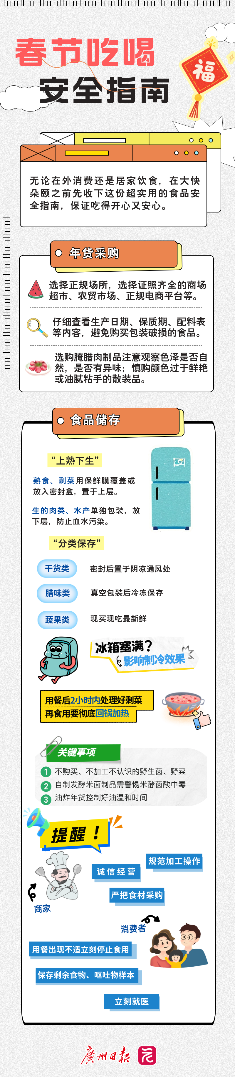 提醒广大餐饮服务单位,食品安全无小事,诚信经营树口碑,严把食材采购,规范加工操作共同守护“年味”,擦亮“食在广州”品牌。
