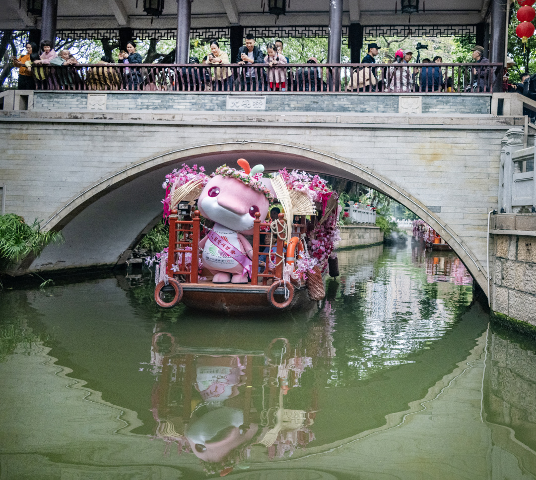 2月12日,“大湾鸡”坐着花船游荔枝湾,桥上的市民游客在围观。
