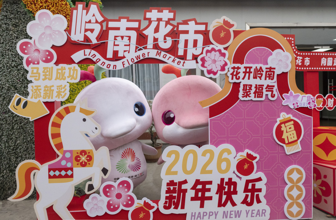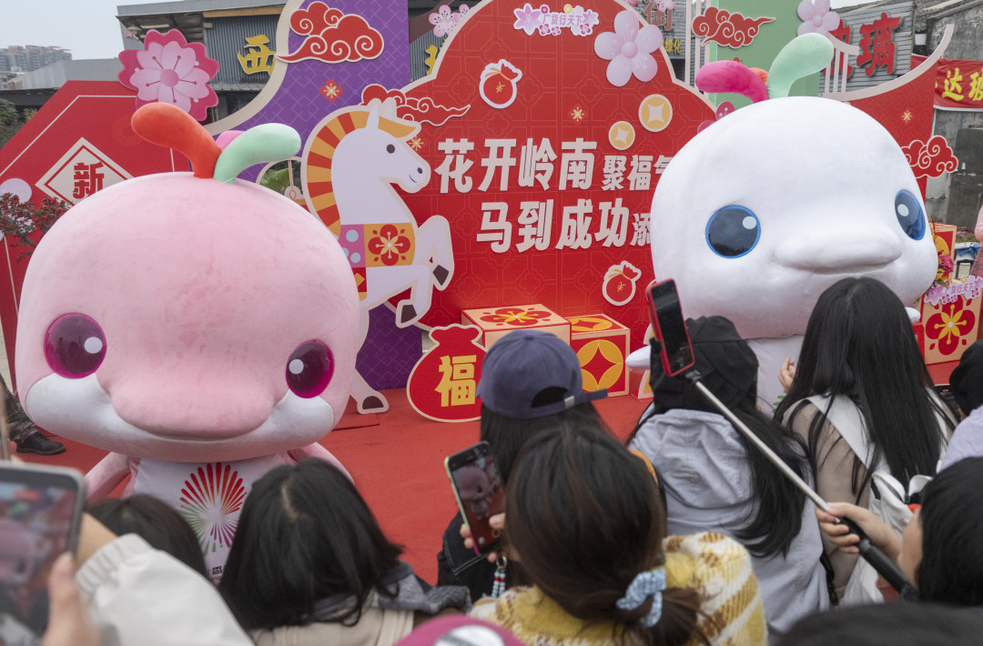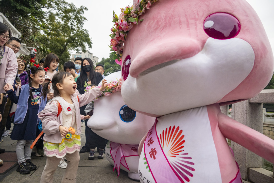 2月12日,广州水上花市,小朋友呼喊着“大湾鸡”的名字冲了过来。