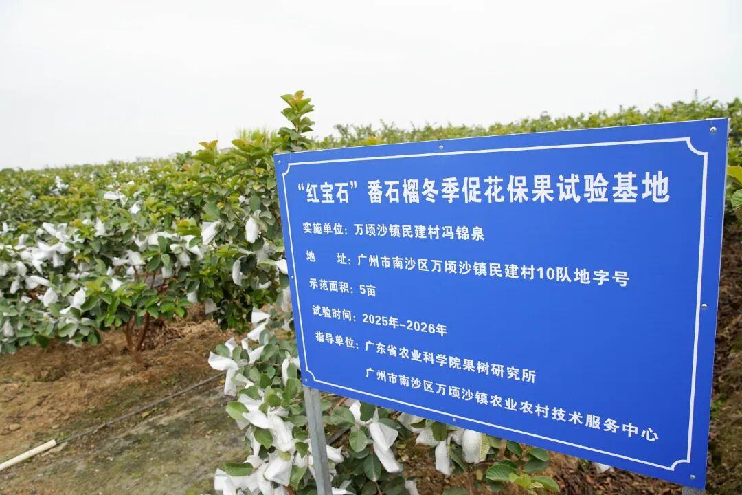 为将万顷沙番石榴打造成万顷沙的“金字招牌”,写实万顷沙镇“土特产”文章,万顷沙镇于2024年推出“红宝石”番石榴种植大礼包。同年5月,万顷沙镇民建村番石榴种植户冯锦泉认领“红宝石”番石榴种植大礼包,并种植约3333平方米“红宝石”番石榴,树体长势旺盛,开花量大,但因幼果期持续落果,最终没有产量。2025年,该地块被列为“红宝石”番石榴保花保果技术攻关试验点,万顷沙番石榴博士工作站团队系统集成与应用了花果调控、营养管理、病虫害绿色防控等配套技术,以提升冬季果的坐果率和果实整齐度。