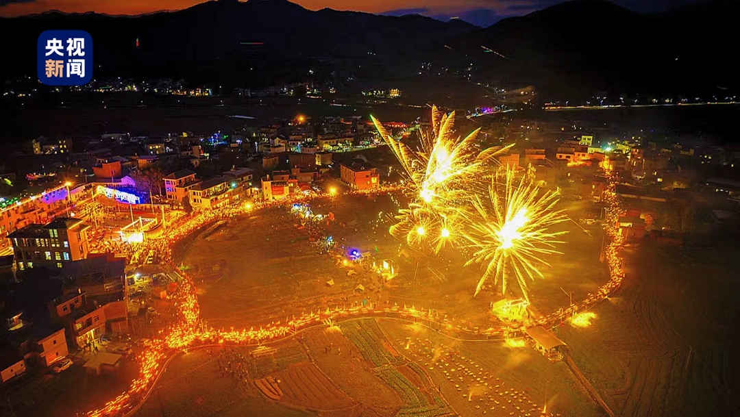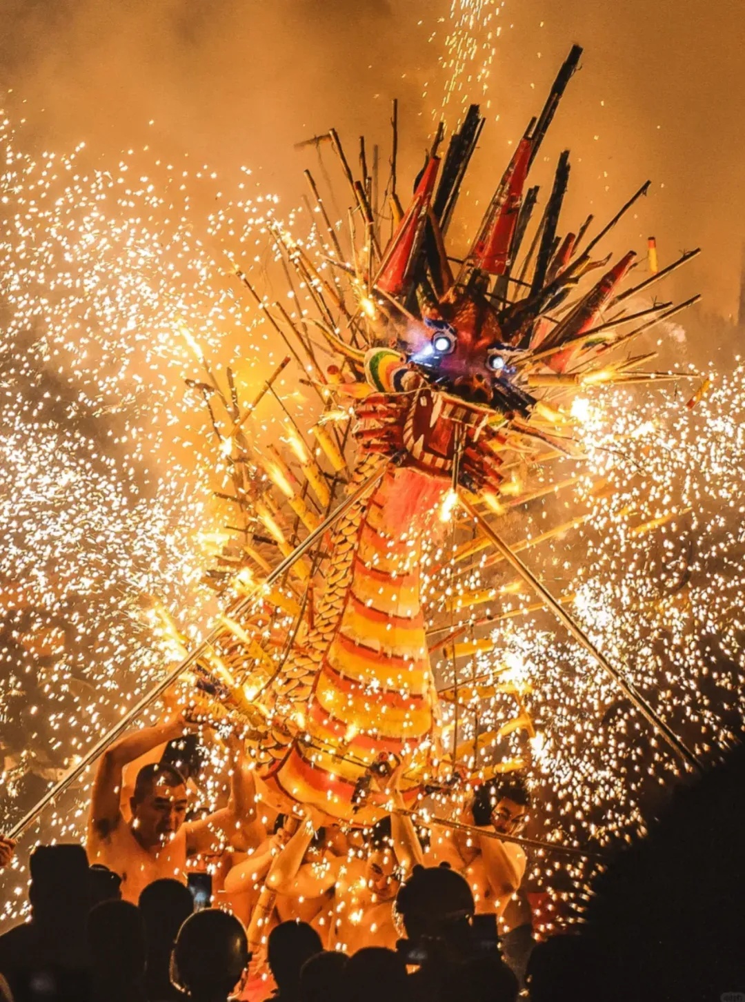 梅州流传着千年非遗丰顺埔寨火龙,是祈求风调雨顺的风俗。数十名赤膊青年手擎火龙腾空而起,加上鲤鱼灯和烟花、爆竹加持,总会引得人们欢呼雀跃。