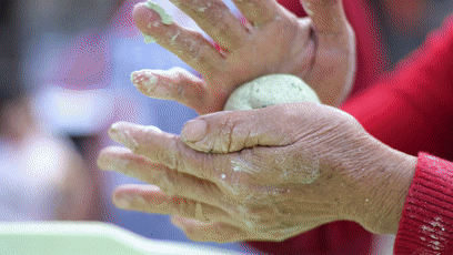 △艾粄。艾叶反复捶打至黏稠状,揉搓至与米粉团相互融合。