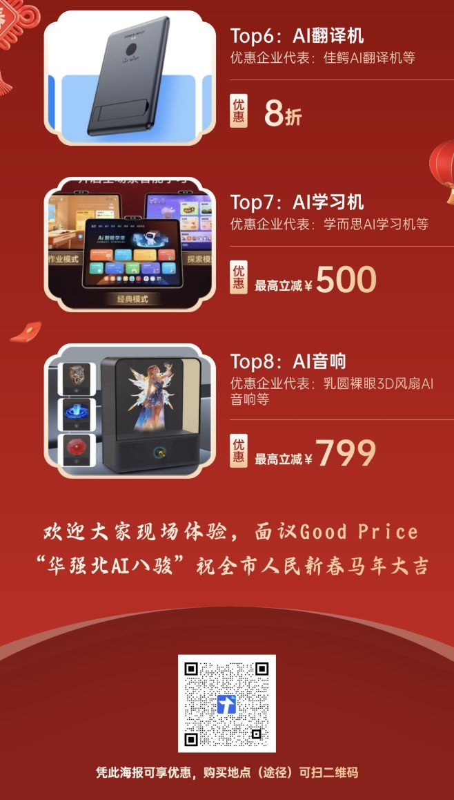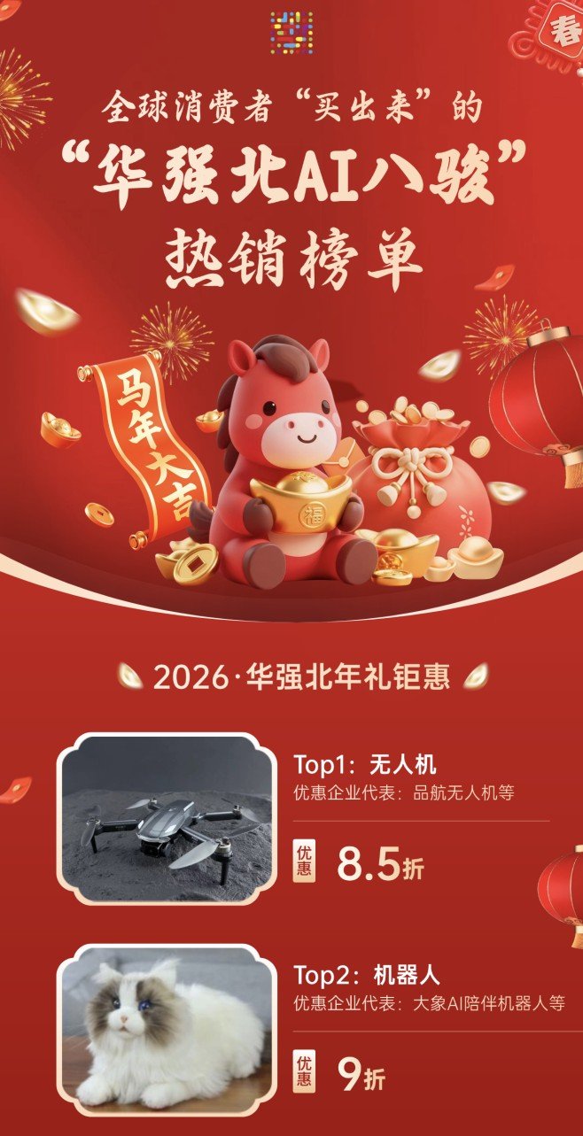多家媒体密集报道后,大量游客和网友在评论区留言,希望街道公布真实销售情况,推出一个权威的热门榜单,为消费者提供购物参考。街道联合各大市场和商户,系统梳理近两个月真实销售数据,形成“华强北AI八骏”榜单。联合本土企业推出专属新春重磅优惠,凭宣传海报即可轻松兑现福利,为广大市民和海内外客商奉上一场科技与年味交织的消费盛宴。