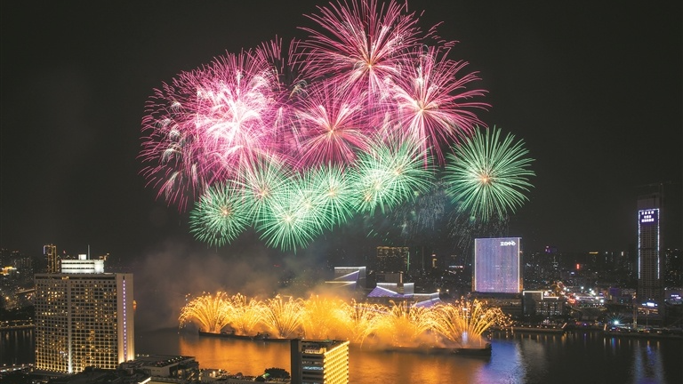 2025年大年初一,广州白鹅潭春节烟花汇演照亮江面上空。(资料图)