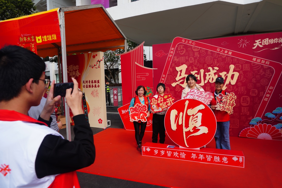 赏花之余,一场“声音导览”同步进行。志愿者将视障读者引至花市入口,面朝正中央那座体量庞大的金色雕塑,开始口述:“此刻我们正对着天河花市主牌楼。正中央是一座金色雕塑,由无数片流畅弯曲的金属条带层层翻卷、向上升腾,像被风吹起的绸缎,也像汹涌奔腾的海浪。条带顶部汇聚成一匹昂首奋蹄的骏马,呼应2026丙午马年。金色的‘浪涛’间,点缀着多朵正红色木棉花造型的仿真年花,哑光花瓣与耀眼金芒交相辉映,寓意‘花开富贵’‘马年兴旺’。”
