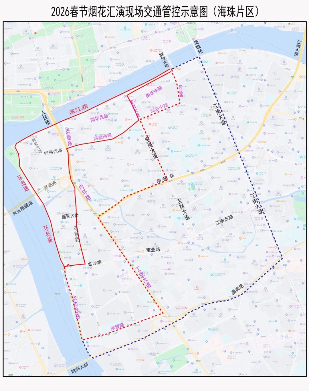2026年2月17日17:00至19:00视情况、19:00至活动结束,对镇安路、黄沙大道(油脂厂信号灯以东路段,只允许车辆往珠江隧道方向通行)、六二三路实施临时交通管理措施。