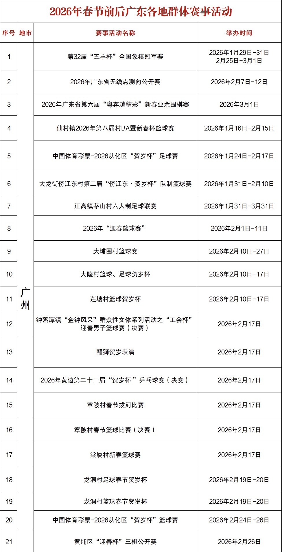 为深入贯彻全民健身国家战略,丰富群众春节假期精神文化生活,营造喜庆祥和的新春氛围,2026年春节前后,广东省各地精心组织了一系列覆盖城乡、层级多元、特色鲜明的群众体育赛事活动,从城市场馆到乡村赛场,从线上云端到线下实景,让群众在运动中感受新春活力。