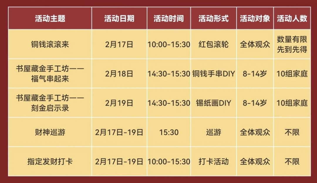 据馆方发布的消息,春节期间,岭南金融博物馆正常开放,拟推出“骏马溯金史,新元启财章”春节主题系列活动。2月17日(初一)至19日(初三),热闹非凡的财神巡游率先登场,观众可在博物馆邂逅传统节庆的欢乐氛围,感受浓浓年味与喜庆气息;2月18日(初二)至19日(初三),“书屋藏金手工坊”活动连开2场,可以亲身体验手工艺术独特魅力;2月17日(初一)至23日(初七)博物馆更设置有“新春许愿树”,游客们可以将自己的期望、对生活的美好憧憬写在许愿卡上。众多活动将让观众在喜庆祥和的氛围中,全方位感受金融文化与春节习俗的完美融合。