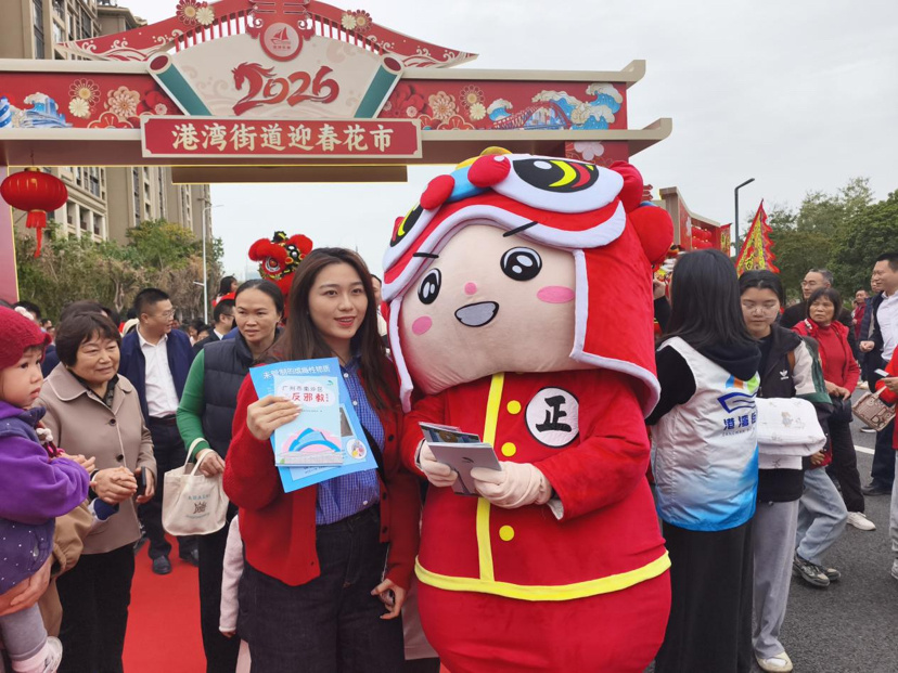 “妈妈快看!那个醒狮好得意!”大年廿八,港湾街道迎春花市人山人海,上午十点,一个身穿醒狮服、戴着科技感装饰的卡通人物刚一出现,立刻成了全场的“顶流”——这就是广东省反邪教吉祥物“粤小正”的南沙首秀。
