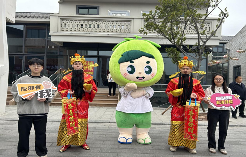万顷沙镇的“水岸新岁·花漾万顷”迎春花市里,两位“人气王”联手出道——青柠吉祥物和财神爷举着“反邪有我”“擦亮眼睛看清邪教”的牌子,在花市中巡游送福,走到哪儿都是围观的街坊。