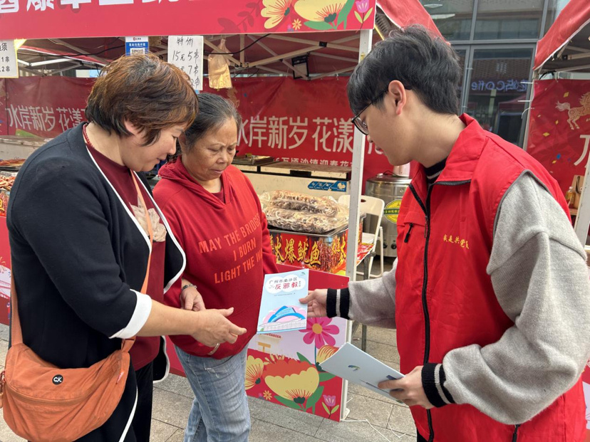 珠江街的花市入口处,一群穿着红马甲的志愿者格外显眼。他们支起反邪教宣传摊位,向过往街坊发放资料,耐心讲解邪教的危害和骗人手法。