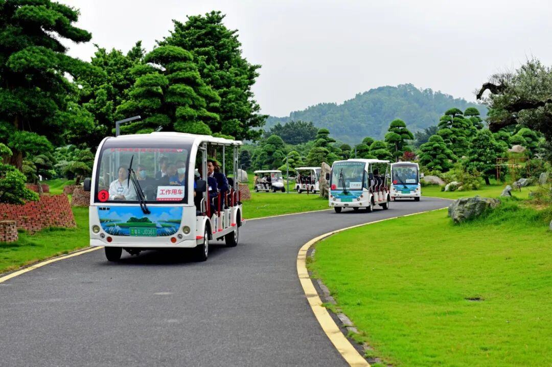 ▲乘车游览竹洞村盆景 姚日文 摄