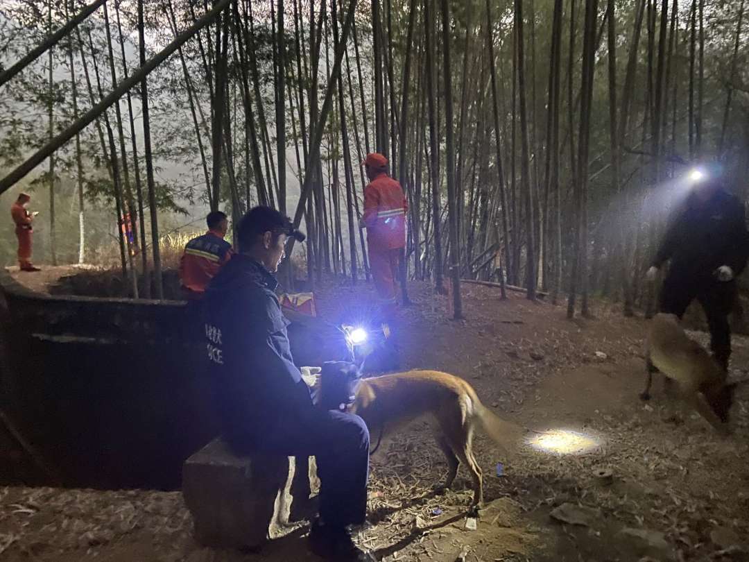 面对五指山山高林密、地形复杂、夜间能见度低的严峻挑战,现场指挥部快速研判,科学统筹,搭建起“空中无人机巡航+地面地毯式搜索”的立体化“空—地”救援体系。多架搭载红外热成像技术的无人机迅速升空,对失联人员可能出现的区域进行不间断、全覆盖的空中侦察与精准排查,并同步作好空投应急物资的准备。与此同时,地面搜救队伍携带搜救犬,分批分组,向着深山腹地进发。