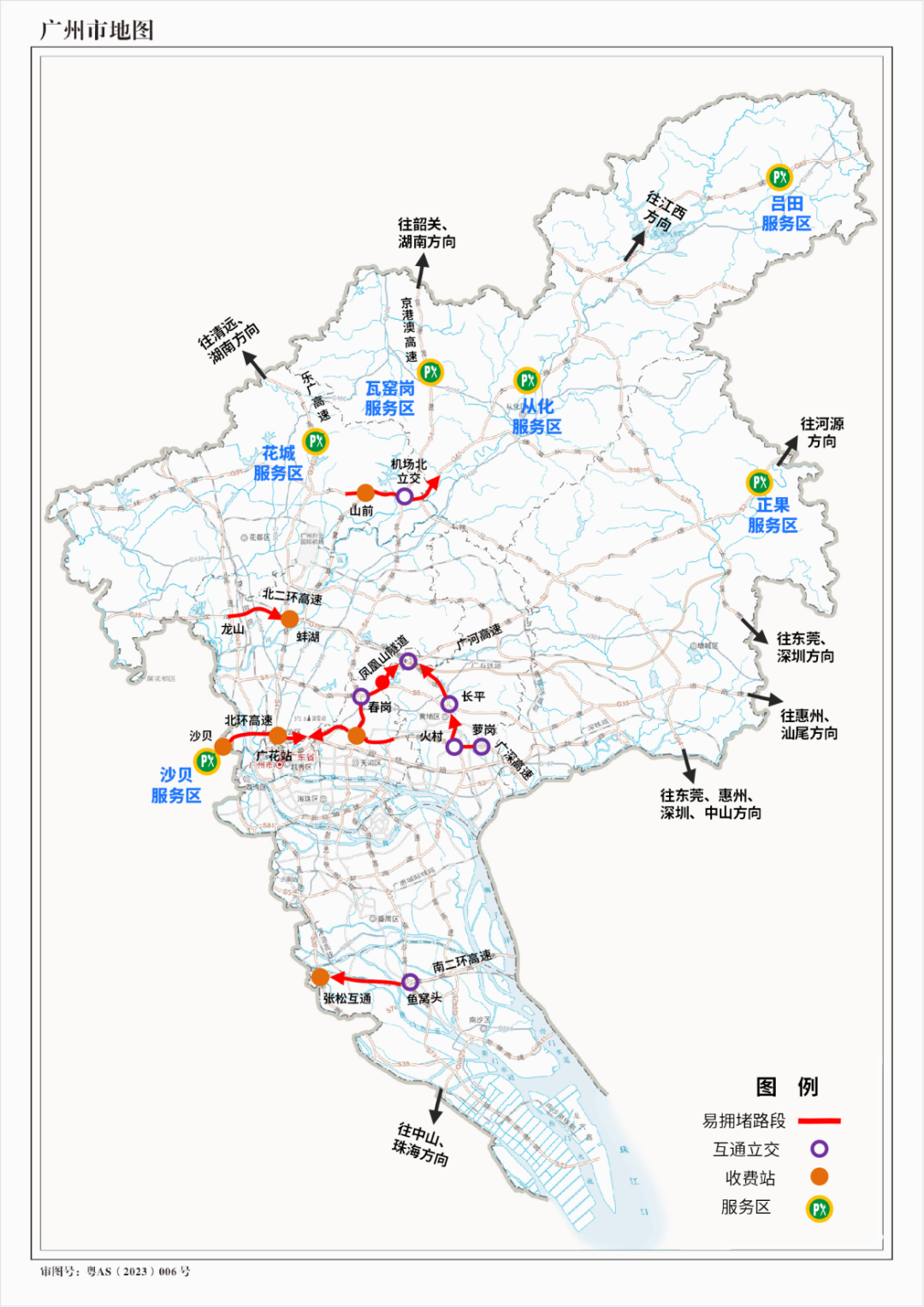 其中出城高峰,易缓慢路段集中在北环高速(沙贝—广花收费站段)、广河高速(春岗立交—凤凰山隧道段)、南二环高速(鱼窝头互通—张松互通路段)、广深高速(萝岗立交—火村立交段)、北二环高速(火村立交—长平立交段、龙山至蚌湖路段)等路段。