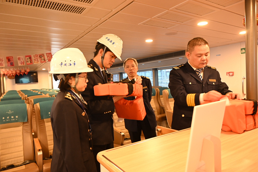 海事部门对每一艘即将启航的高速客船开展安全检查,重点检查船舶消防、救生、通讯设备状态,核查船员适任情况和值班安排,叮嘱船员严格遵守航行规则、密切关注航行水域气象变化,确保船舶适航、船员适任。同时,依托智慧海事系统、视频监控和无人机巡查,对客运航线水域实施动态监控,及时排查通航隐患、疏导水上交通,用专业守护让旅客返乡归途安稳顺心。