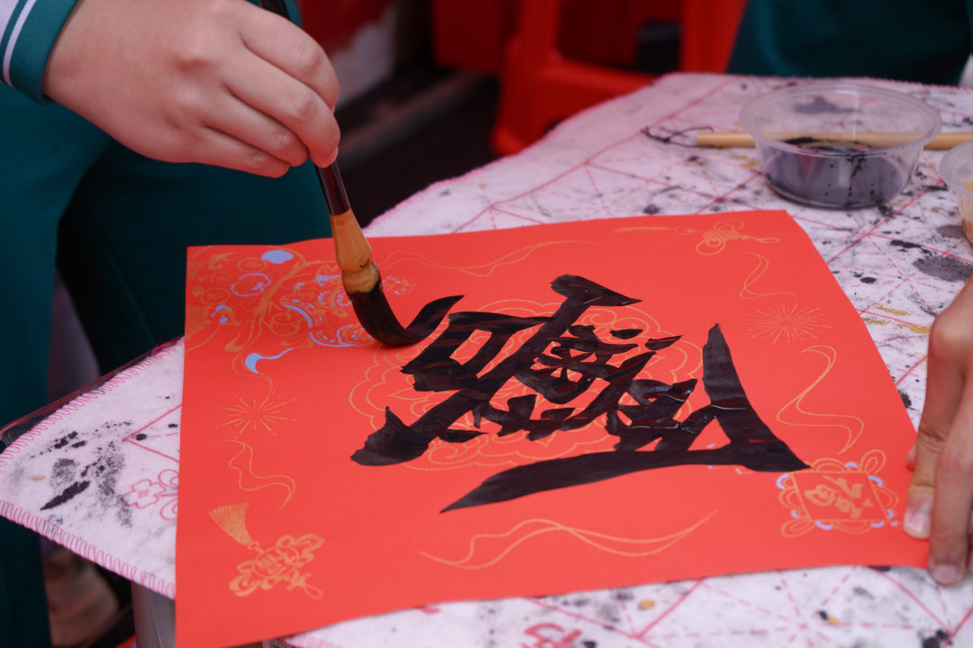 “马到功成”“龙马精神”……一幅幅马年珲春、春联跃然纸上。广州天省实验学校学生志愿者化身“摊位爱心主理人”,现场挥毫手写珲春、春联,同步开展爱心义卖活动,学生原创文创、家长及企业捐赠的爱心物资整齐陈列,涵盖转运风车、年福字贴、喜庆挂饰等,每一件物品都承载着爱心,让青春力量为慈善事业注入活力。不少市民主动驻足等候,接过同学们递来的春联,“手写的春联有年味,还能支持慈善,太有意义了。”一位市民说。