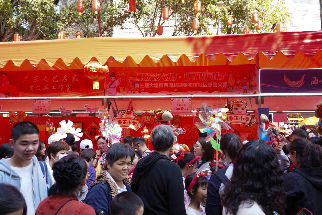 慈善花市上,第三届“聚爱大塘 暖心同行”大塘街西湖迎春花市社区慈善义卖活动开启。年逾九旬的粤语相声泰斗黄俊英老师、本土知名情景喜剧演员何志峰(二五八)惊喜现身,黄俊英老师更是将亲笔挥毫的墨宝捐赠义拍。摊位上,大塘街公益IP“贡仔”以全新舞狮造型亮相,融合骑楼、粤剧、早茶等元素的“广州礼物——大塘贡品”文创礼包一经推出便成“爆款”,吸引众多市民游客打卡。