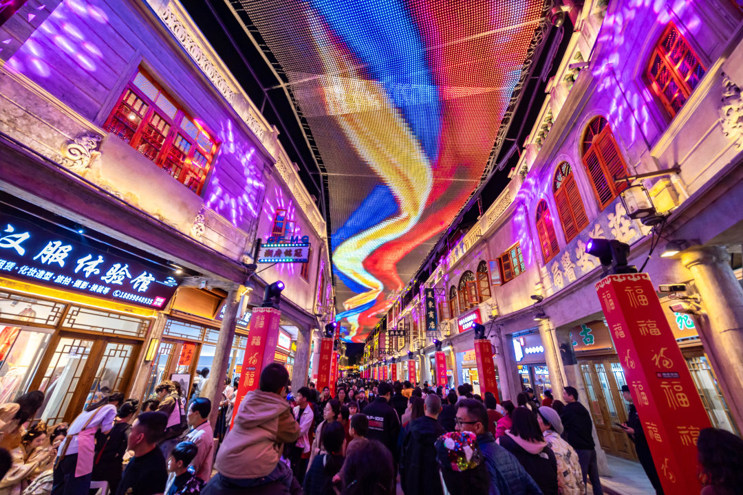 漫步揭阳古城,古树枝头缀满灯笼,暖光透过新叶洒下斑驳光影;玉窖溪两岸,倒影随波流转,将千盏灯火揉碎成一河璀璨。思贤路骑楼街上空,“潮汐”主题天幕光影秀徐徐铺展,以光影为笔,将侨批文化中的家国精神与乡土情怀娓娓道来——这座粤东古邑,正以一场创意与光影的深情相拥,向世界发出邀约:来揭阳,过个有光、有戏、有味的“潮”年。