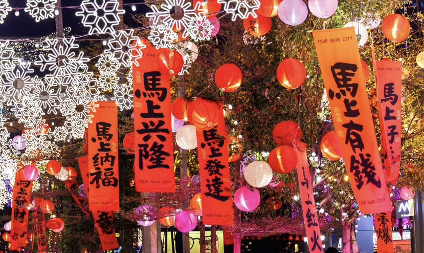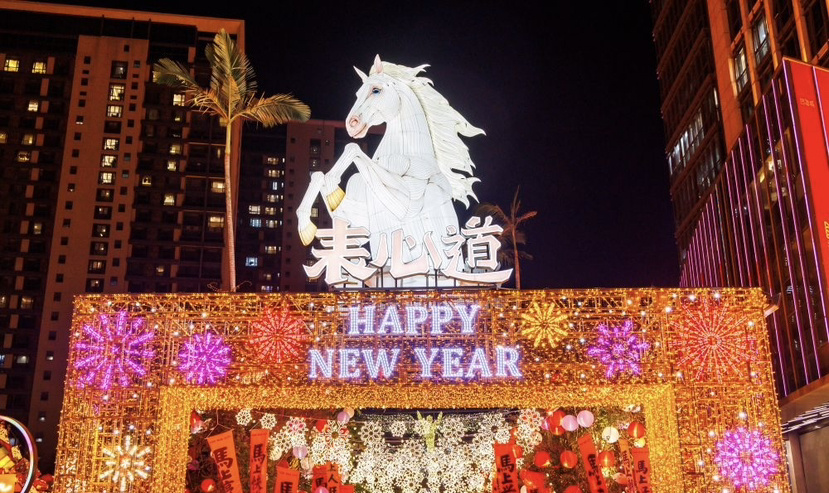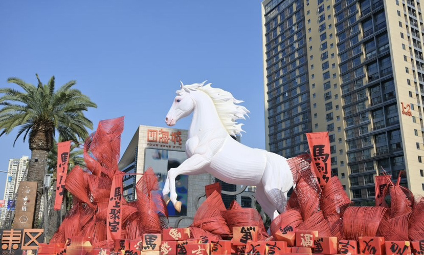 四海城打造了以“汗血宝马”为原型的大型马年美陈装置,造型灵动逼真,同时,马年元素遍布商圈各个角落,黄马雕塑、黑马形象、2026马年主题灯画、艺术钢马,全方位彰显四海城与马年的深厚联结;“马上有钱”“马到功成”……商圈核心景点表心道悬挂的千幅挥春,红韵流转间尽显传统年味与商业活力,成为市民许愿祈福的网红打卡地。