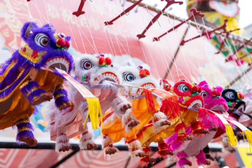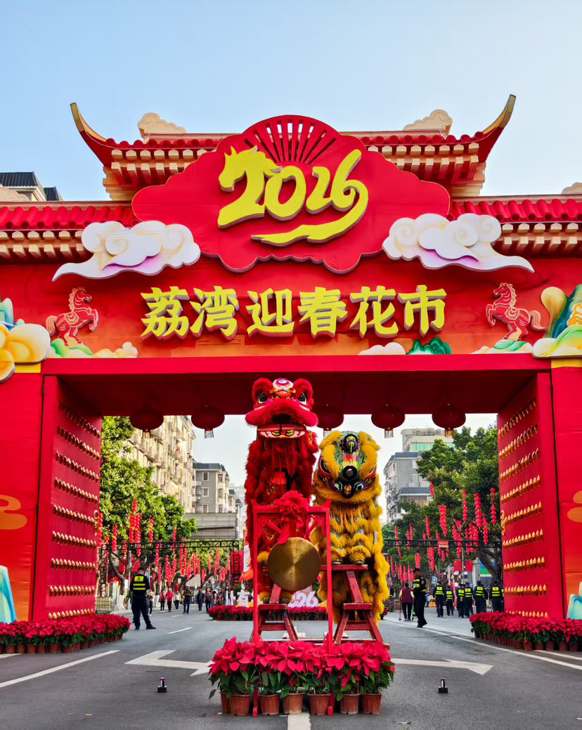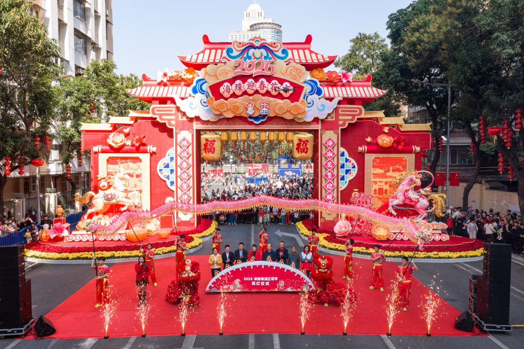 2月14日早上,2026年广州荔湾区传统迎春花市启动仪式在荔湾路与中山七路交界处主牌楼下举行。主牌楼作为迎接八方来客的“岭南迎宾门”,融合岭南传统花窗与马年新春元素,寓意开门纳福、万事如意。在气势雄健的醒狮表演后,嘉宾代表敲响铜锣,与市民群众共同见证迎春花市开市。