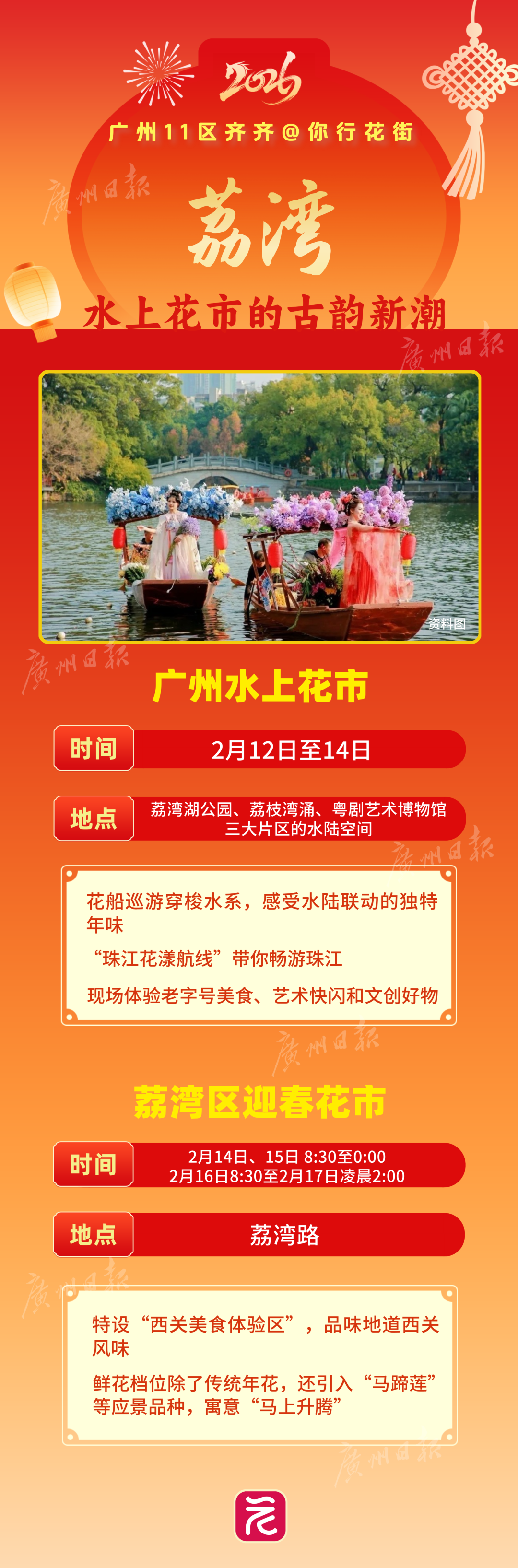 2026年荔湾区传统迎春花市于2月14日(农历腊月廿七)至2月17日(大年初一)凌晨2时在荔湾路举行。相比往年,本届花市品类更多、价格更平,盆花、枝花、工艺品、文化公益等档位一应俱全,既有传统应节花卉,亦有岭南文创、各地美食等特色体验。
